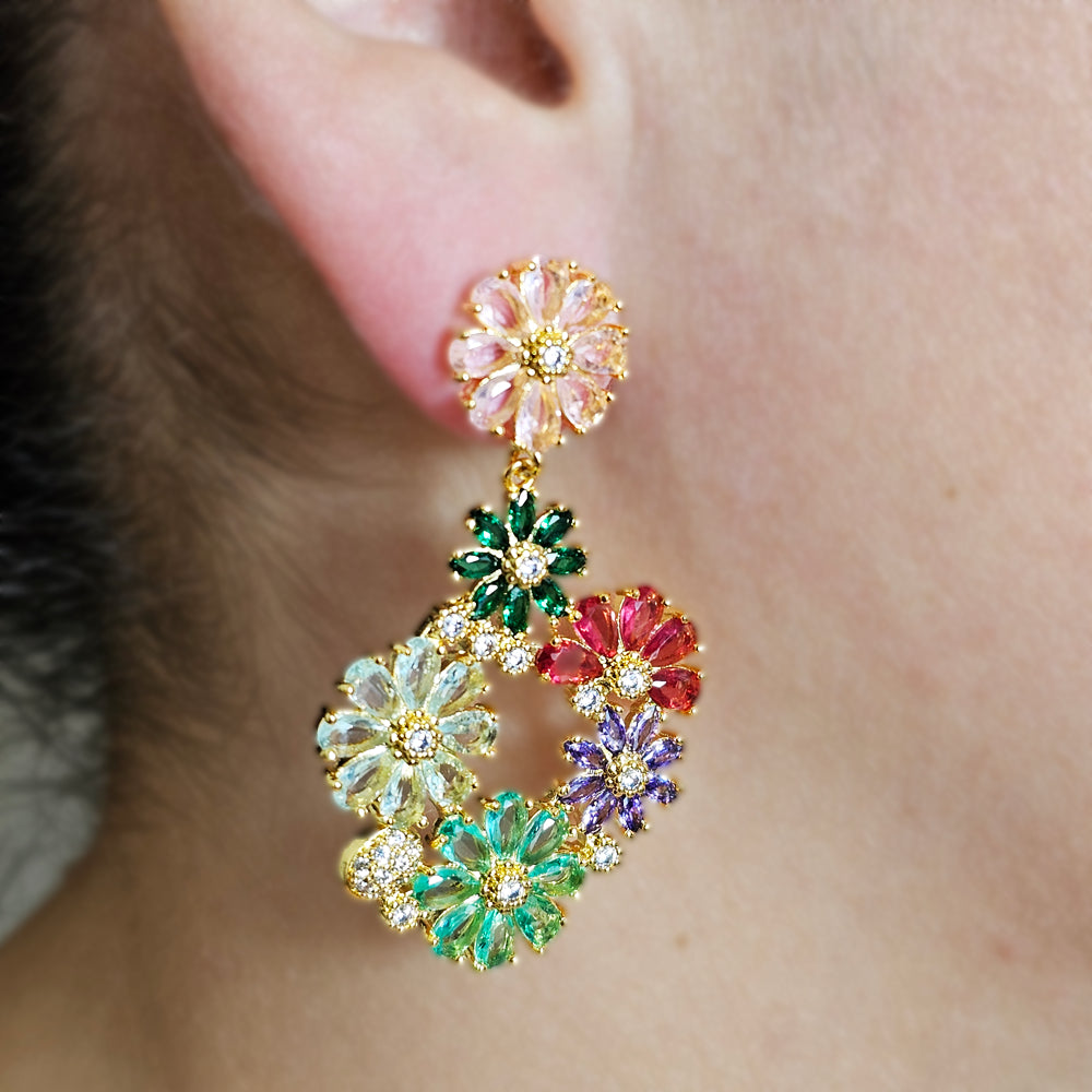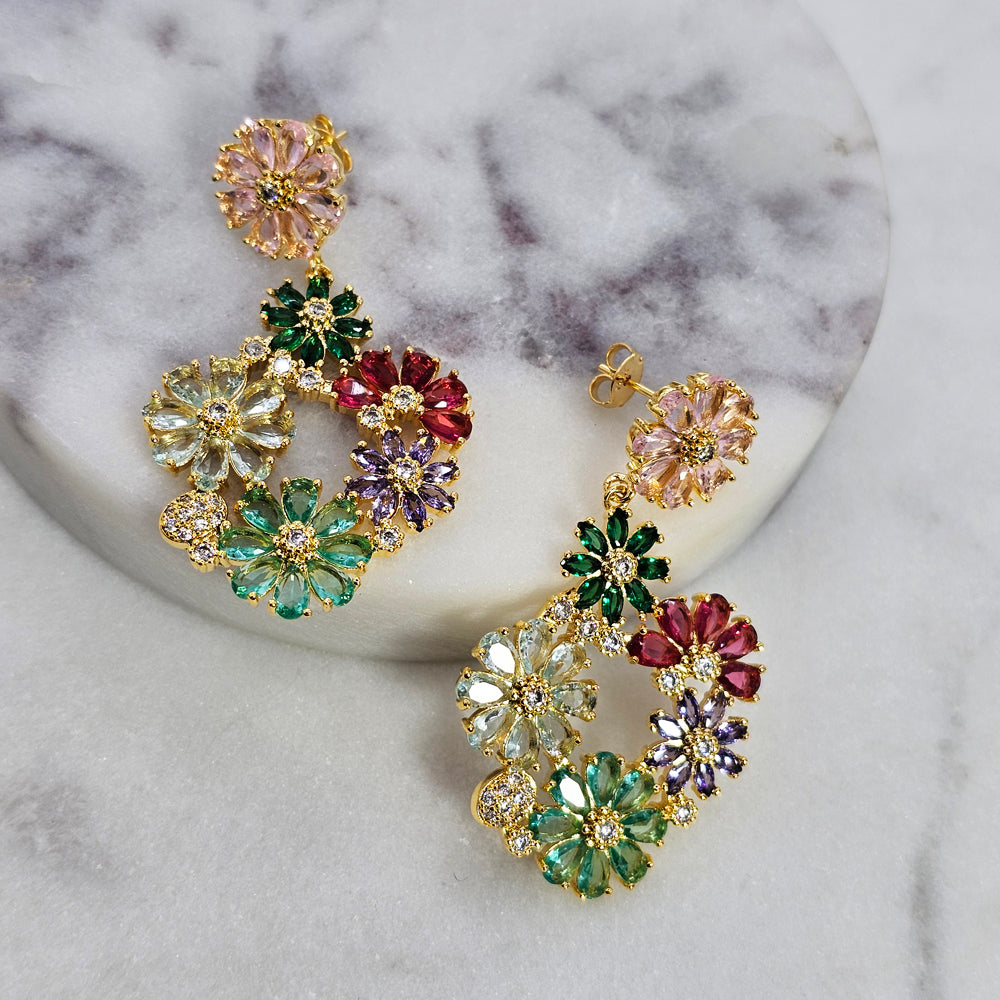 Aro bañado en oro con diseño circular formado por delicadas flores multicolor, cada una adornada con brillantes cristales que reflejan la luz desde cada ángulo. Su composición floral crea un efecto armonioso y elegante, combinando tonos verdes, lilas, rosados y dorados que aportan frescura y sofisticación, Livianos, llamativos y perfectos para destacar cualquier look con un toque femenino y radiante. Ideal para ocasiones especiales o para elevar un outfit cotidiano con un accesorio lleno de encanto.