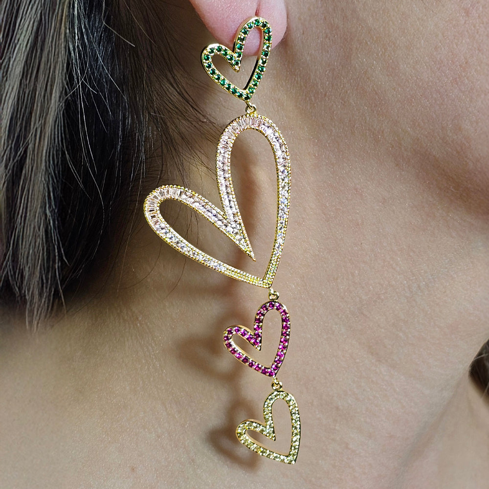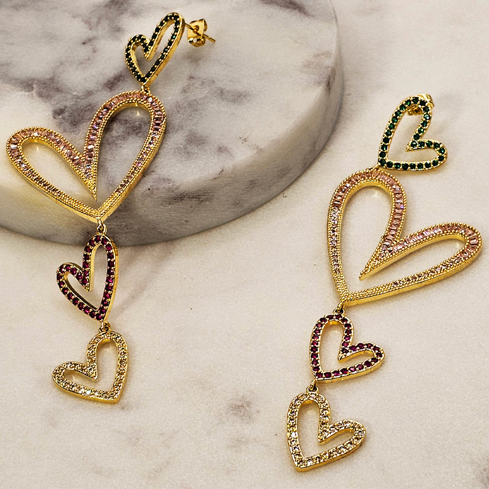 Un diseño encantador que combina la calidez del baño de oro con el brillo vibrante de corazones engastados en cristales verde, rosa, lila y dorado. Cada corazón, delicadamente trabajado, se une al siguiente en una cadena armoniosa que se balancea con suavidad, creando destellos de luz y color en cada movimiento. Una pieza romántica y sofisticada, perfecta para iluminar cualquier look con alegría y elegancia.