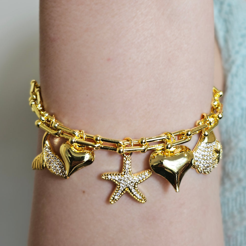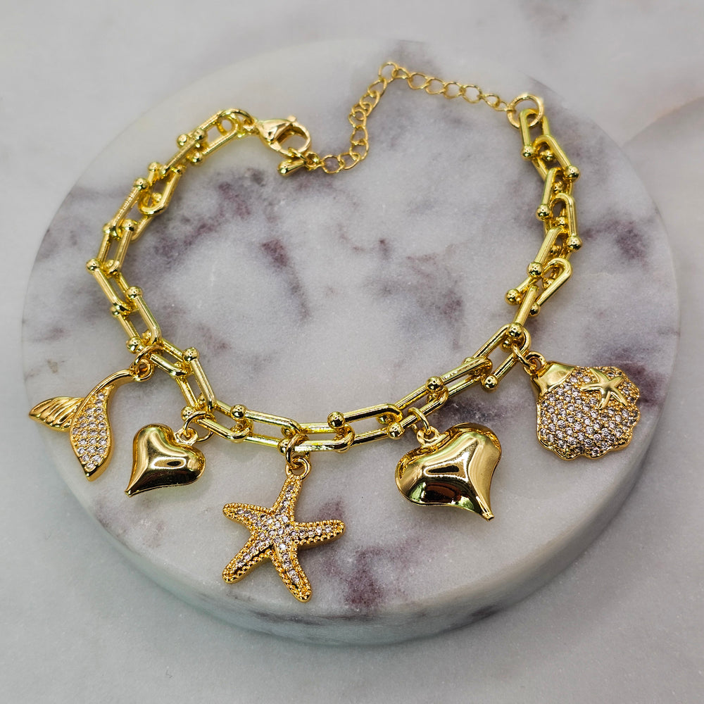 Pulsera bañada en oro con charms de corazones combinados con delicados adornos marinos como cola de sirena, estrella de mar y caracola, todos finamente adornados con circones. Una joya elegante y brillante que refleja el encanto y la magia del mar.