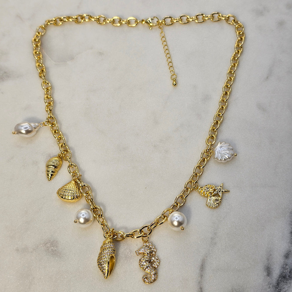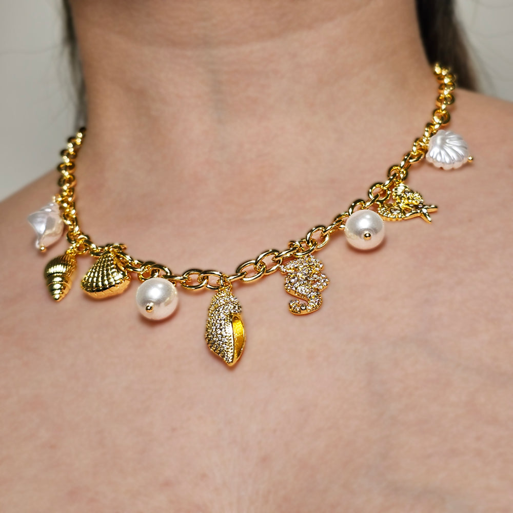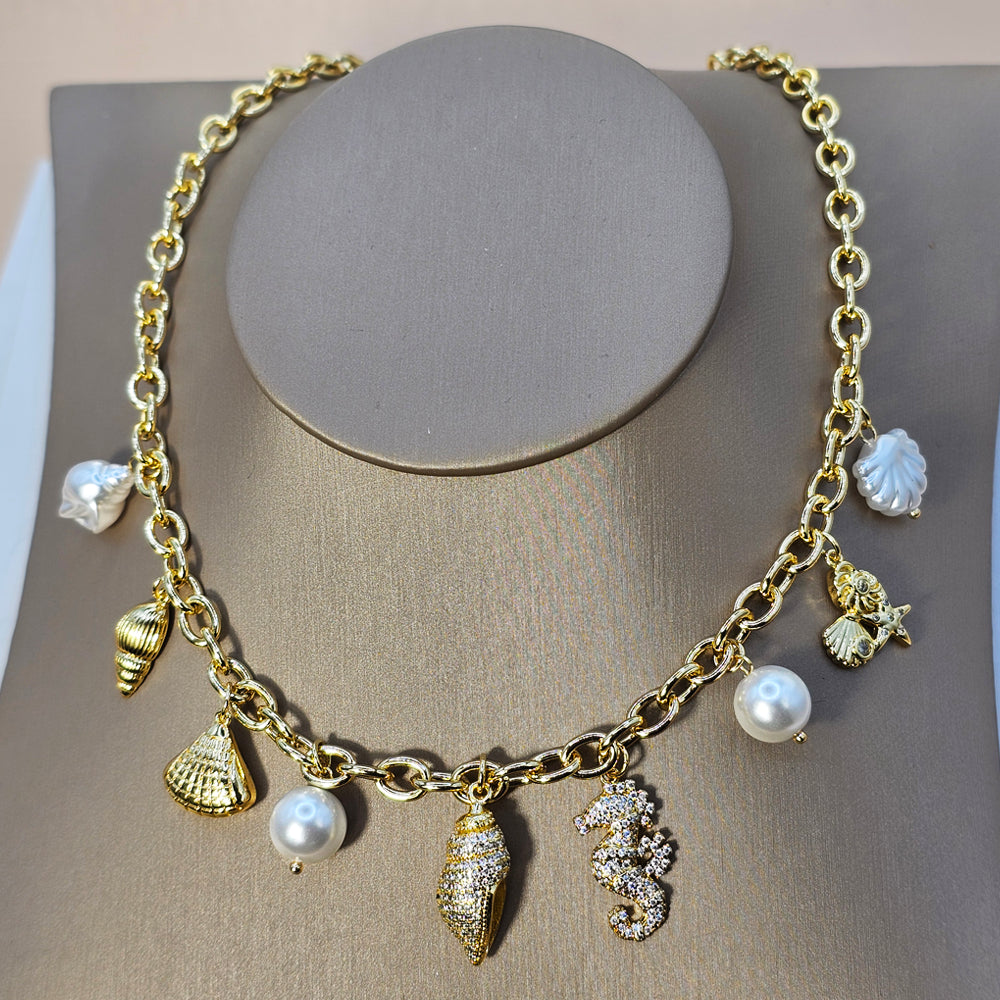 Sofisticado collar bañado en oro, decorado con charms de temática marina, incluyendo caracola, caballito de mar y estrella de mar. Una joya elegante que evoca la frescura y el encanto del océano.