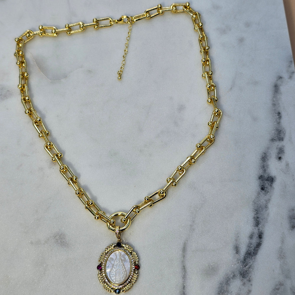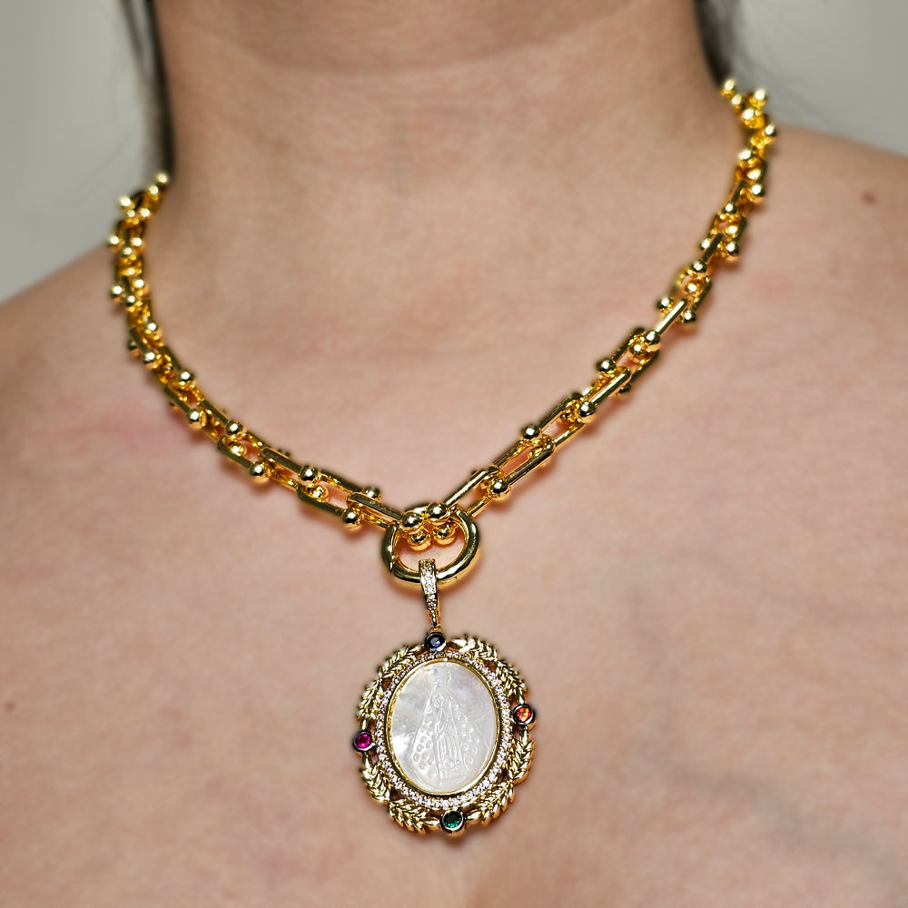 Sofisticado collar bañado en oro, de eslabones elegantes, con colgante religioso que exhibe la imagen de la Virgen tallada en nácar, adornada con finos circones y cristales de colores. Una joya refinada que combina devoción, brillo y distinción.