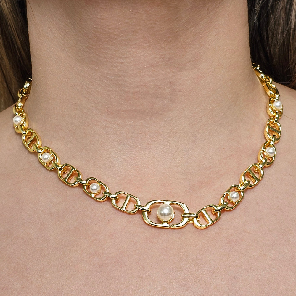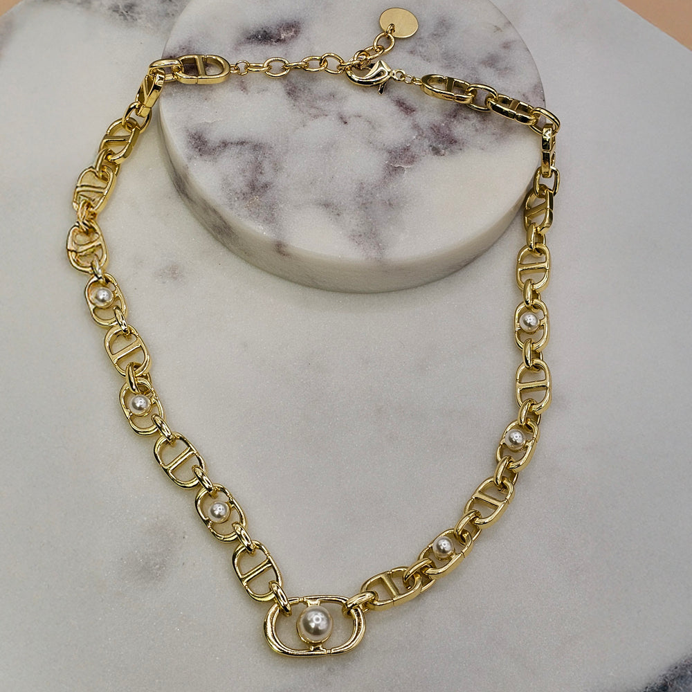 Un diseño refinado que combina una cadena de eslabones de ilusión bañada en oro con delicadas perlas distribuidas sutilmente, aportando un brillo suave y un aire de elegancia atemporal. Ideal para realzar cualquier look con distinción y feminidad.