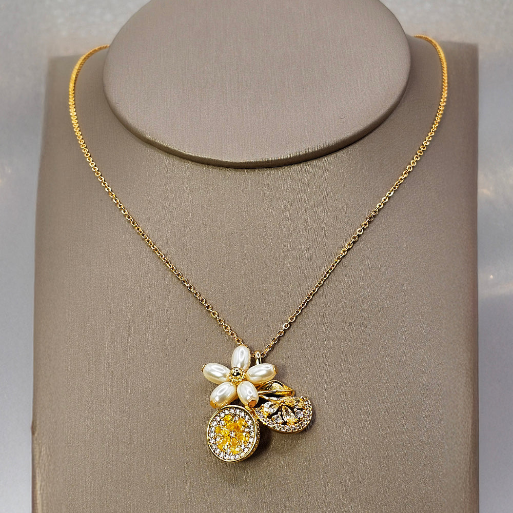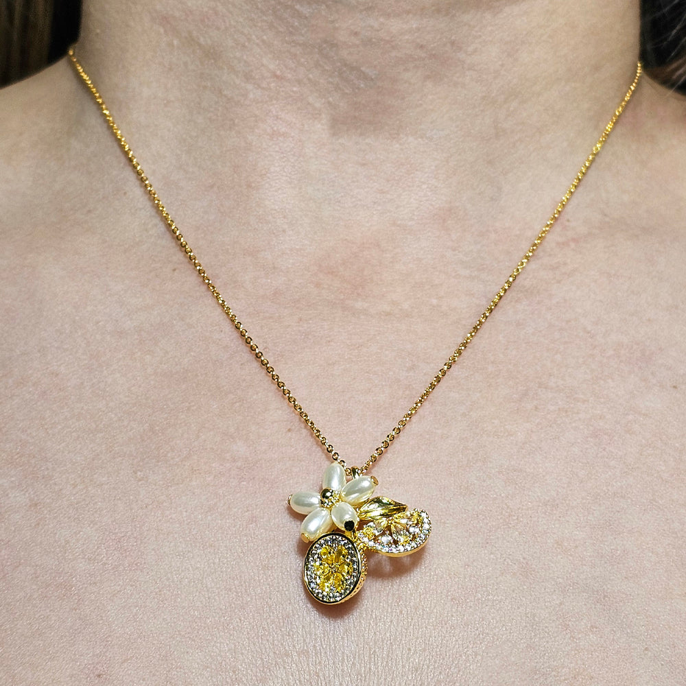 La delicadeza de una cadena fina bañada en oro se combina con el encanto atemporal de una flor trabajada con detalle. A su lado, un elegante adorno circular cubierto de cristales añade destellos sutiles que realzan la pieza. Un diseño femenino y refinado, ideal para aportar un toque de luz y sofisticación a cualquier estilo.