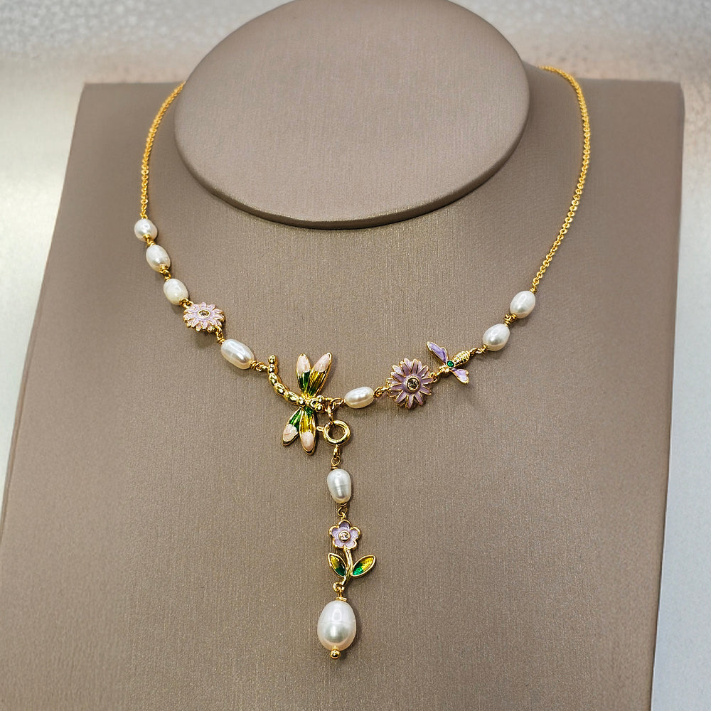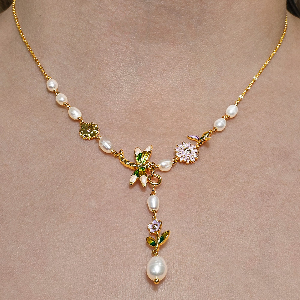 Un diseño delicado y armonioso que combina la sutileza de una cadena fina bañada en oro con pequeñas perlas entrelazadas que aportan un brillo suave y elegante. El colgante presenta una libélula nacarada, símbolo de ligereza y transformación, de la cual emerge una delicada enredadera floral que culmina en una hermosa perla. Una pieza femenina y sofisticada, perfecta para realzar cualquier look con encanto natural y distinción.