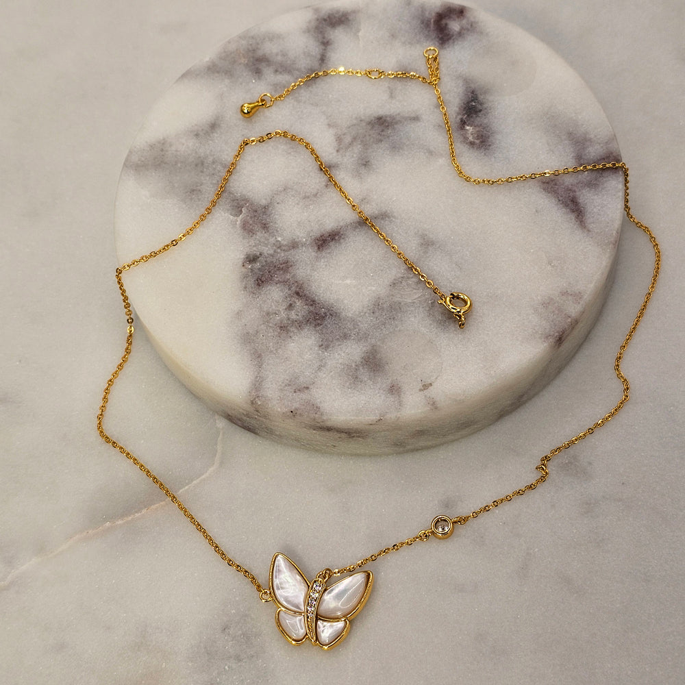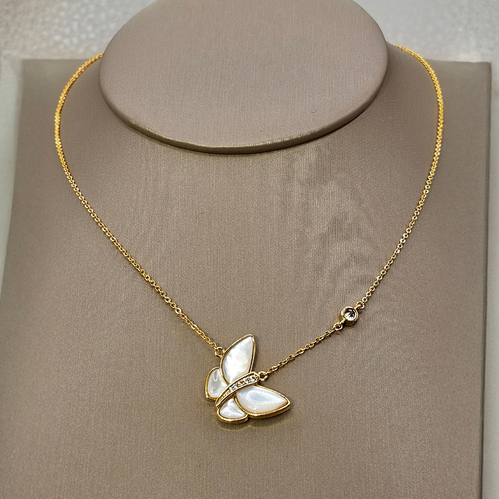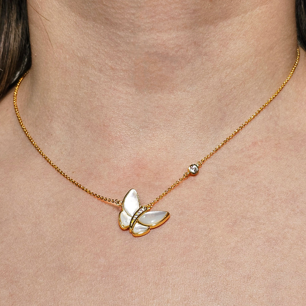 La delicadeza de una cadena fina bañada en oro se combina con el encanto de una mariposa nacarada, cuyas alas reflejan suaves matices de luz. Pequeños cristales, discretamente engastados, añaden destellos sutiles que realzan su elegancia. Una pieza femenina y refinada, ideal para aportar un toque de distinción y dulzura a cualquier estilo.