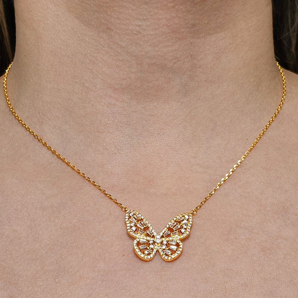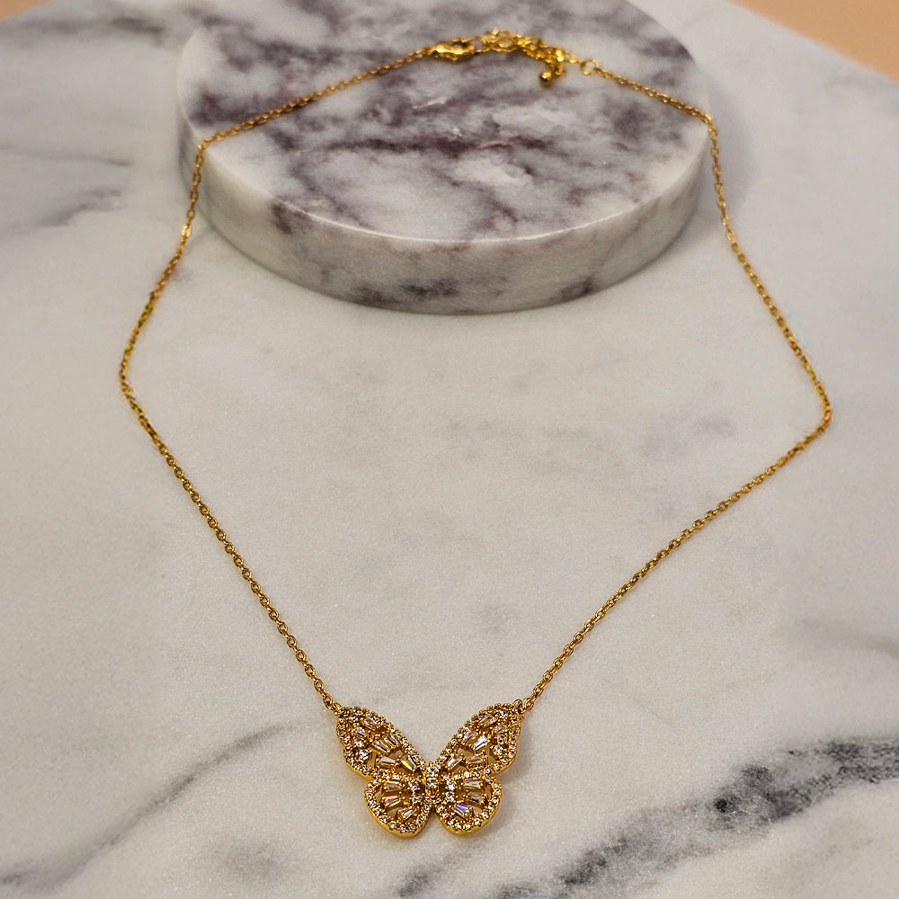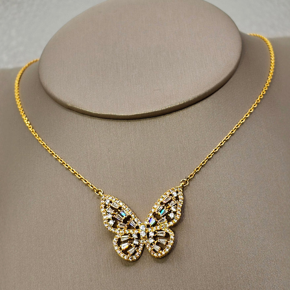 La sutileza de una cadena fina bañada en oro se realza con un colgante en forma de mariposa completamente engastada con cristales blancos, que capturan la luz con un brillo radiante. Un diseño elegante y femenino que simboliza gracia y transformación, ideal para aportar un toque de sofisticación y luminosidad a cualquier look.
