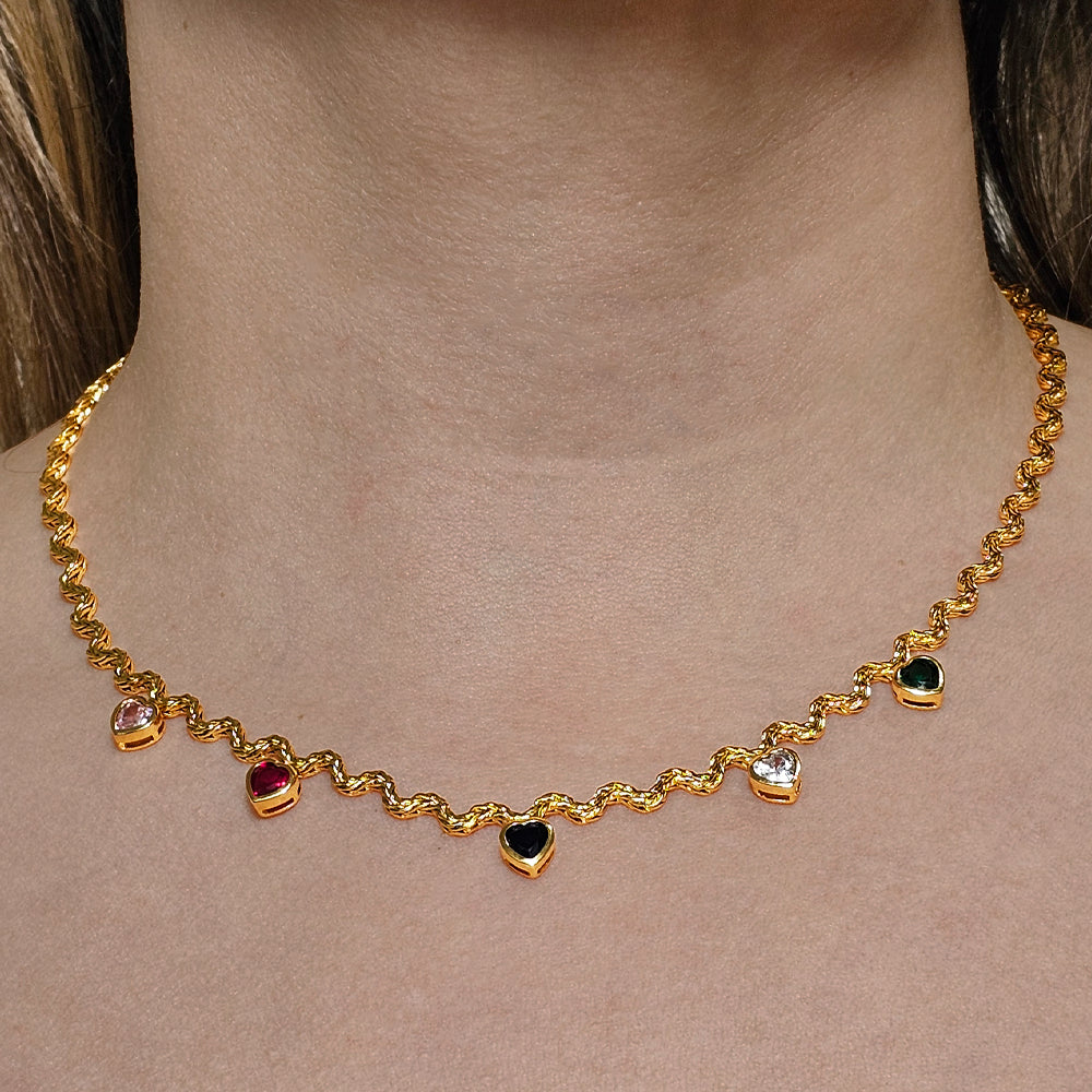 Un diseño delicado y luminoso, donde una fina cadena en zigzag bañada en oro sostiene sutiles colgantes en forma de corazón, cada uno con un punto de luz en tonos rosa, rojo, azul, blanco y verde. Una pieza llena de encanto y color, perfecta para aportar un toque romántico y alegre sin perder la elegancia.