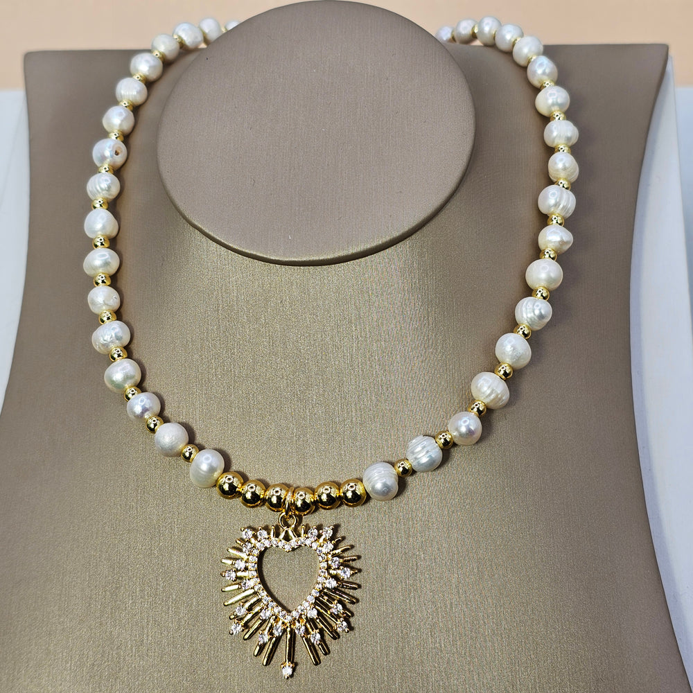 Sofisticado collar bañado en oro, con elegantes perlas de río y un hermoso colgante en forma de corazón con destellos, adornado con finos cristales. Una joya delicada y brillante que combina elegancia y encanto atemporal.