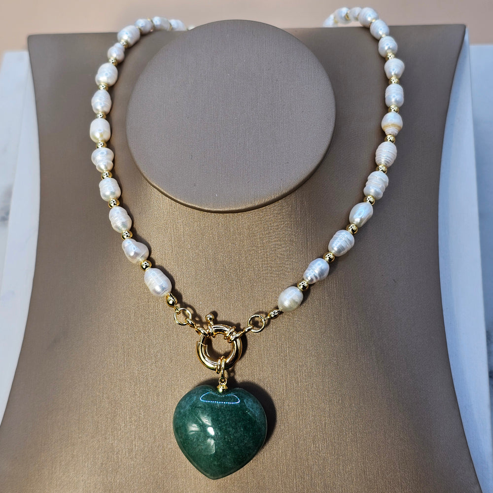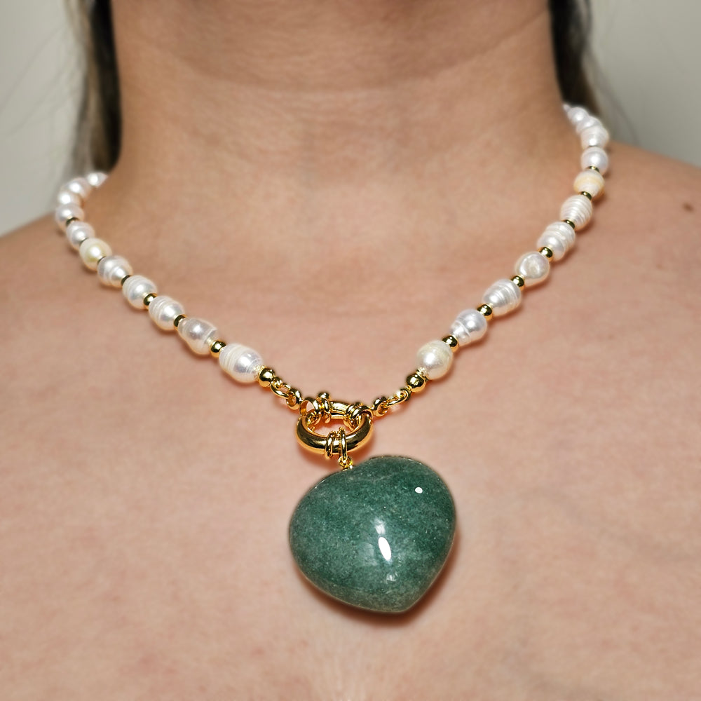 Elegante collar bañado en oro, elaborado con finas perlas de río y un colgante en forma de corazón tallado en cuarzo verde. Una pieza distintiva que combina la calidez natural de las gemas con la sofisticación del diseño clásico.
