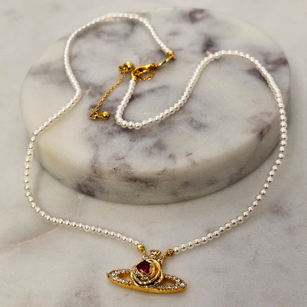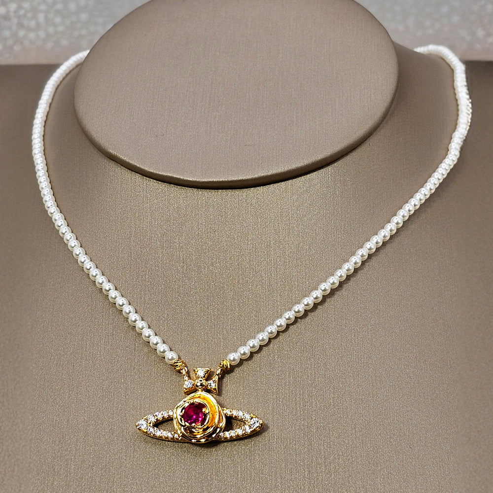 Un diseño celestial que combina la delicadeza de pequeñas perlas con el brillo cálido del baño de oro. La pieza culmina en un colgante que simula un planeta, con un cristal rojo en el centro que evoca pasión y energía, rodeado de sutiles circones que añaden destellos luminosos. Una joya elegante y distintiva, perfecta para quienes buscan un toque de originalidad con sofisticación.