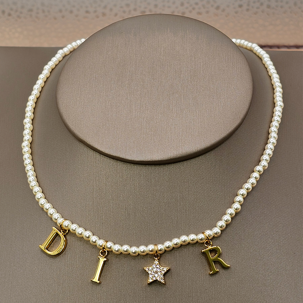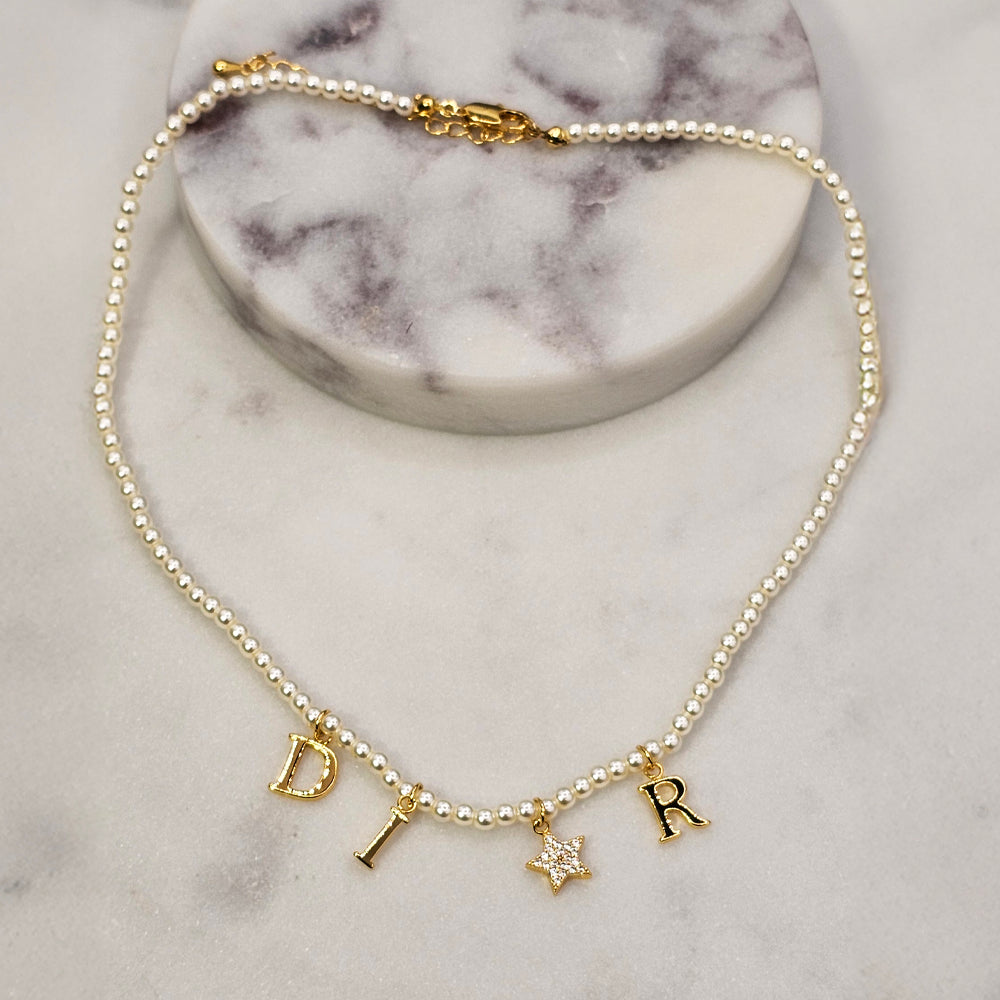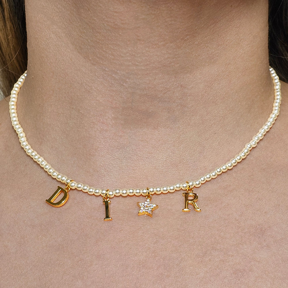 Un diseño delicado que combina la calidez del baño de oro con la elegancia sutil de pequeñas perlas distribuidas a lo largo de la cadena. El colgante, formado por las letras D I R, se acompaña de una pequeña estrella engastada con finos cristales que añaden un destello encantador. Una pieza personalizada y sofisticada, perfecta para aportar un toque único y elegante a cualquier estilo.
