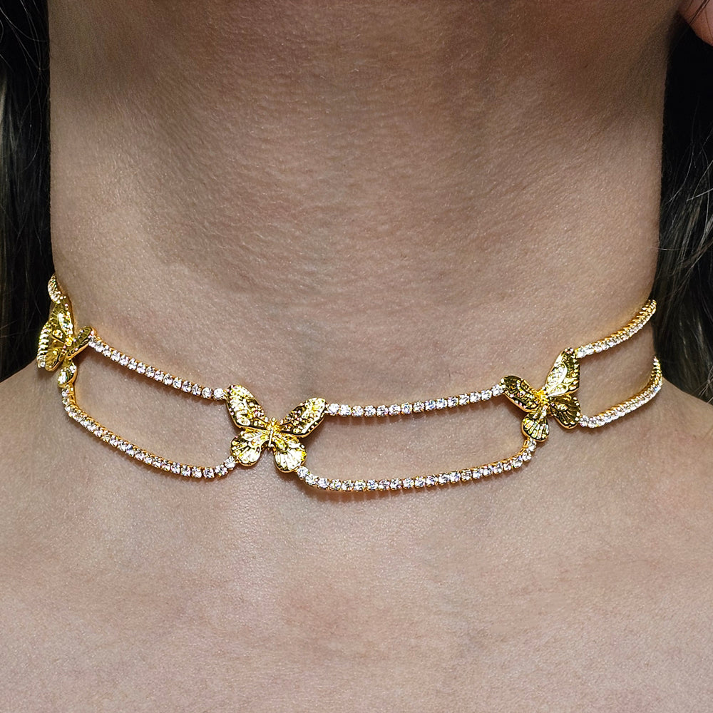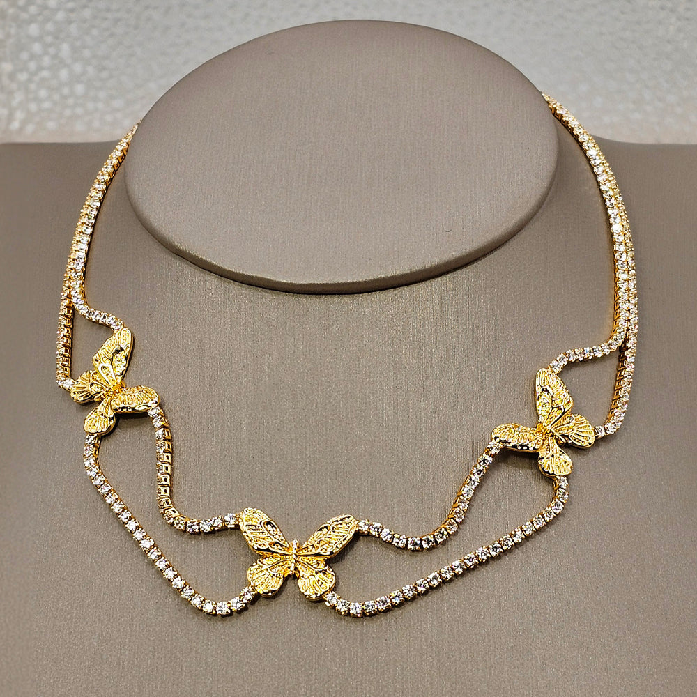 Un diseño cautivador que combina la calidez del baño de oro con el brillo sutil de una cinta de cristales que abraza delicadamente el cuello. Mariposas entrelazadas, trabajadas con finos detalles, unen cada segmento, aportando movimiento y un toque romántico. Una pieza sofisticada y distintiva, perfecta para realzar cualquier look con elegancia y encanto femenino.