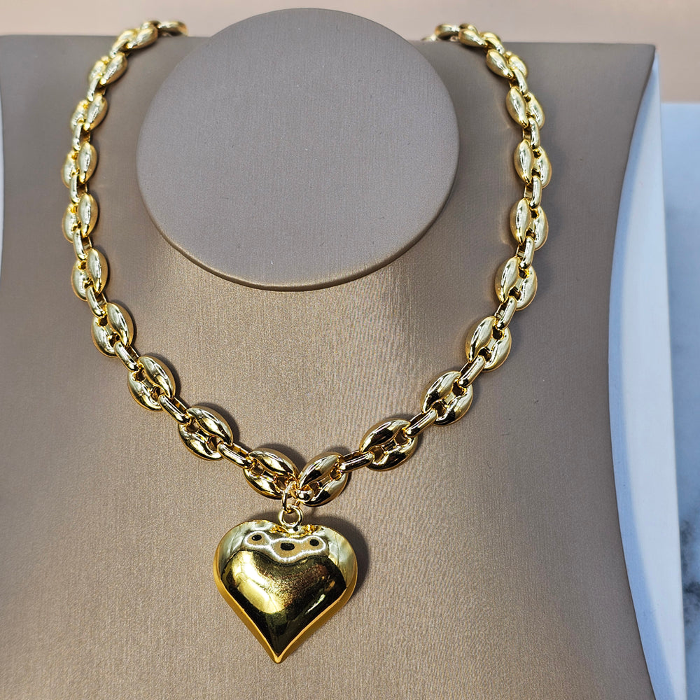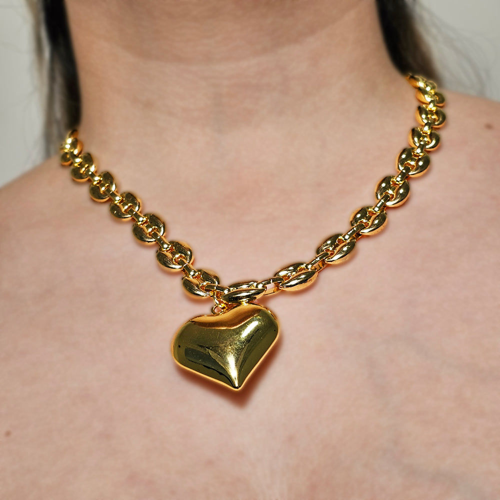 Elegante collar bañado en oro, con eslabones ovalados y colgante de corazón en relieve. Una pieza sofisticada que combina delicadeza, estilo y un diseño atemporal.