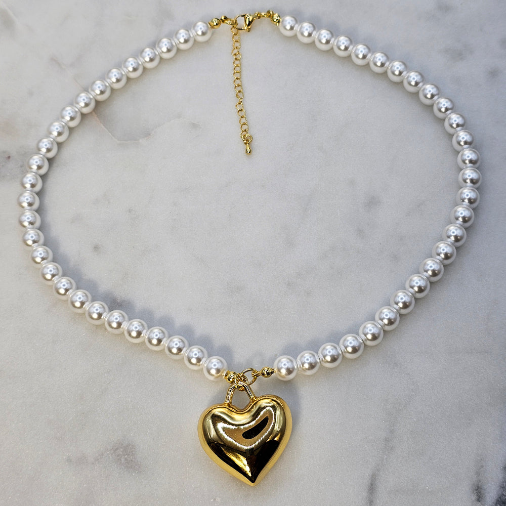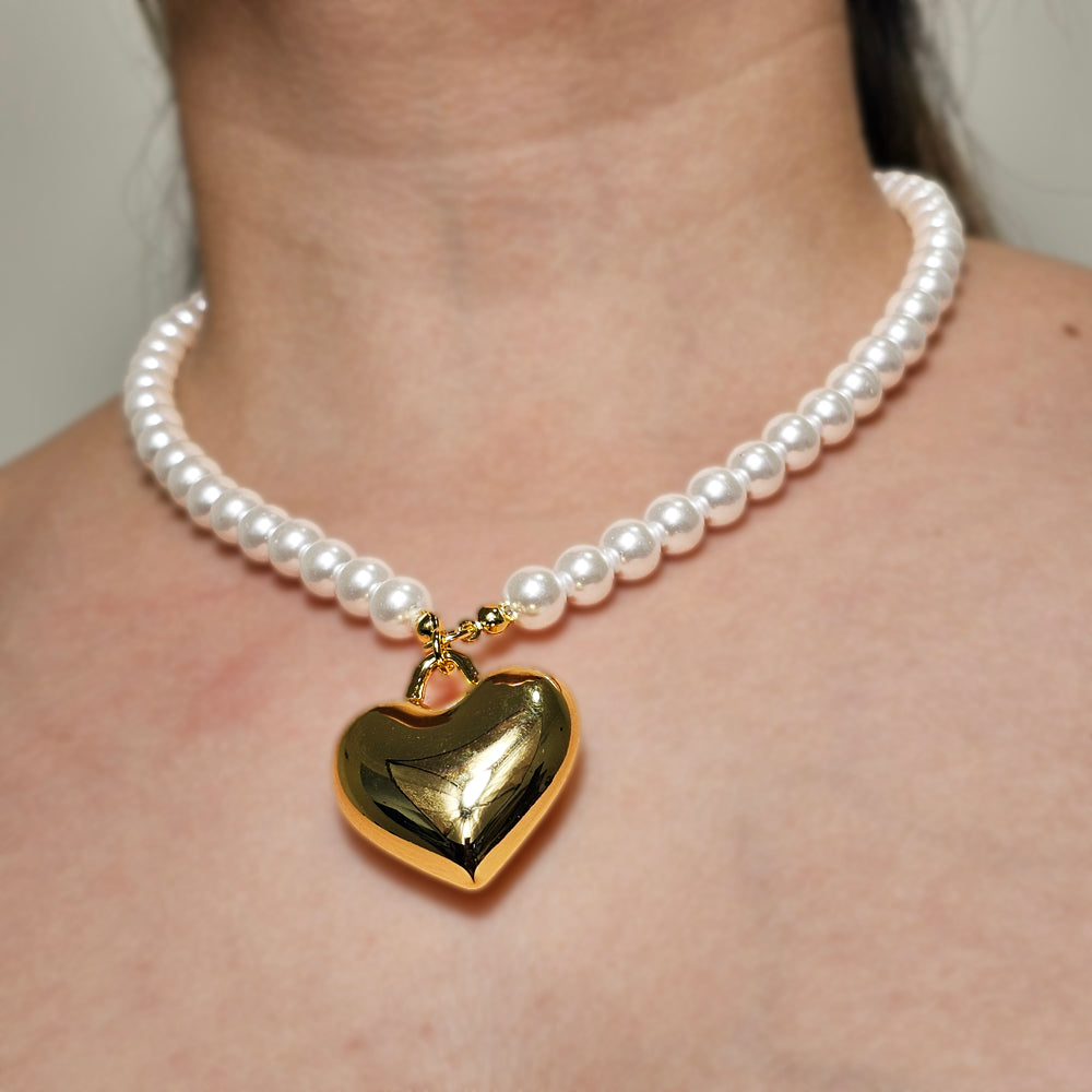 Sofisticado collar bañado en oro, con elegantes perlas blancas y colgante de corazón grande dorado. Una pieza clásica y distintiva que combina elegancia y estilo atemporal.