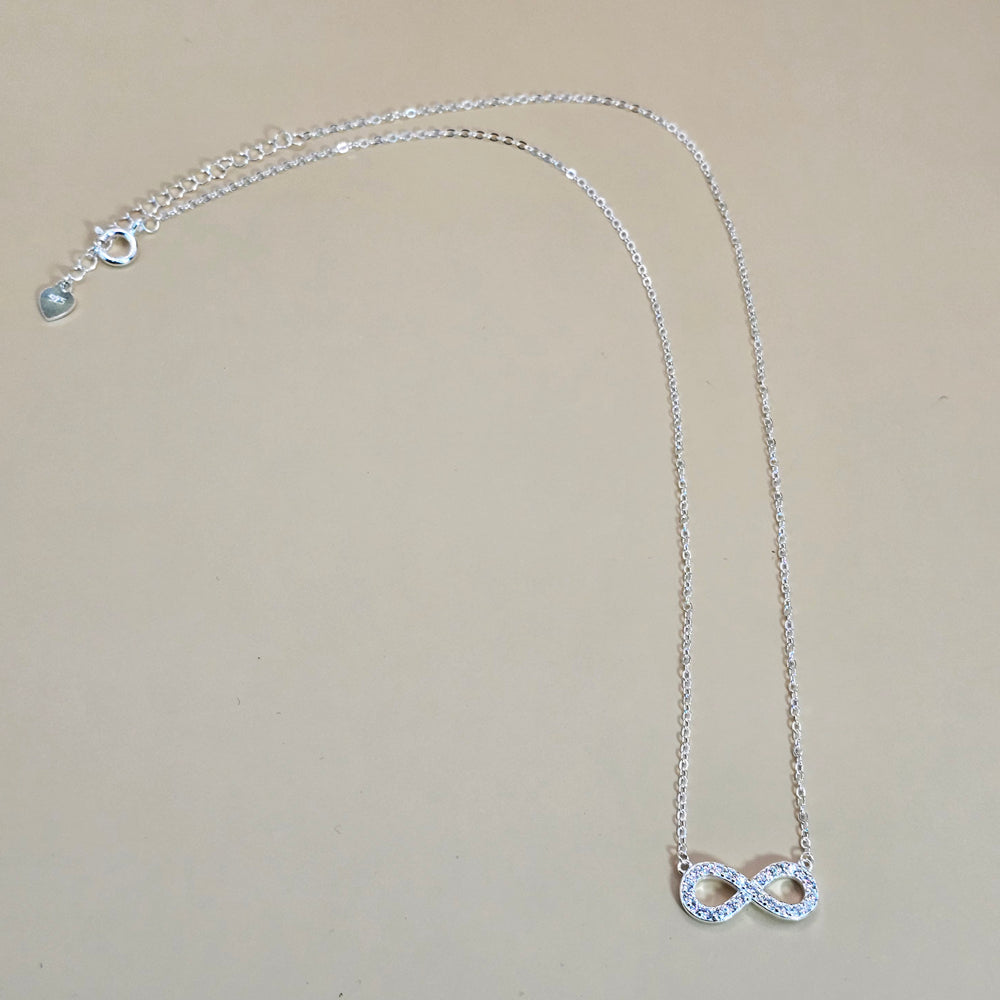 Collar de plata 925 con fina cadena y elegante colgante símbolo infinito, delicadamente adornado con brillantes circones que aportan un destello sofisticado. Una joya atemporal que representa eternidad y estilo, ideal para uso diario o como regalo especial.
