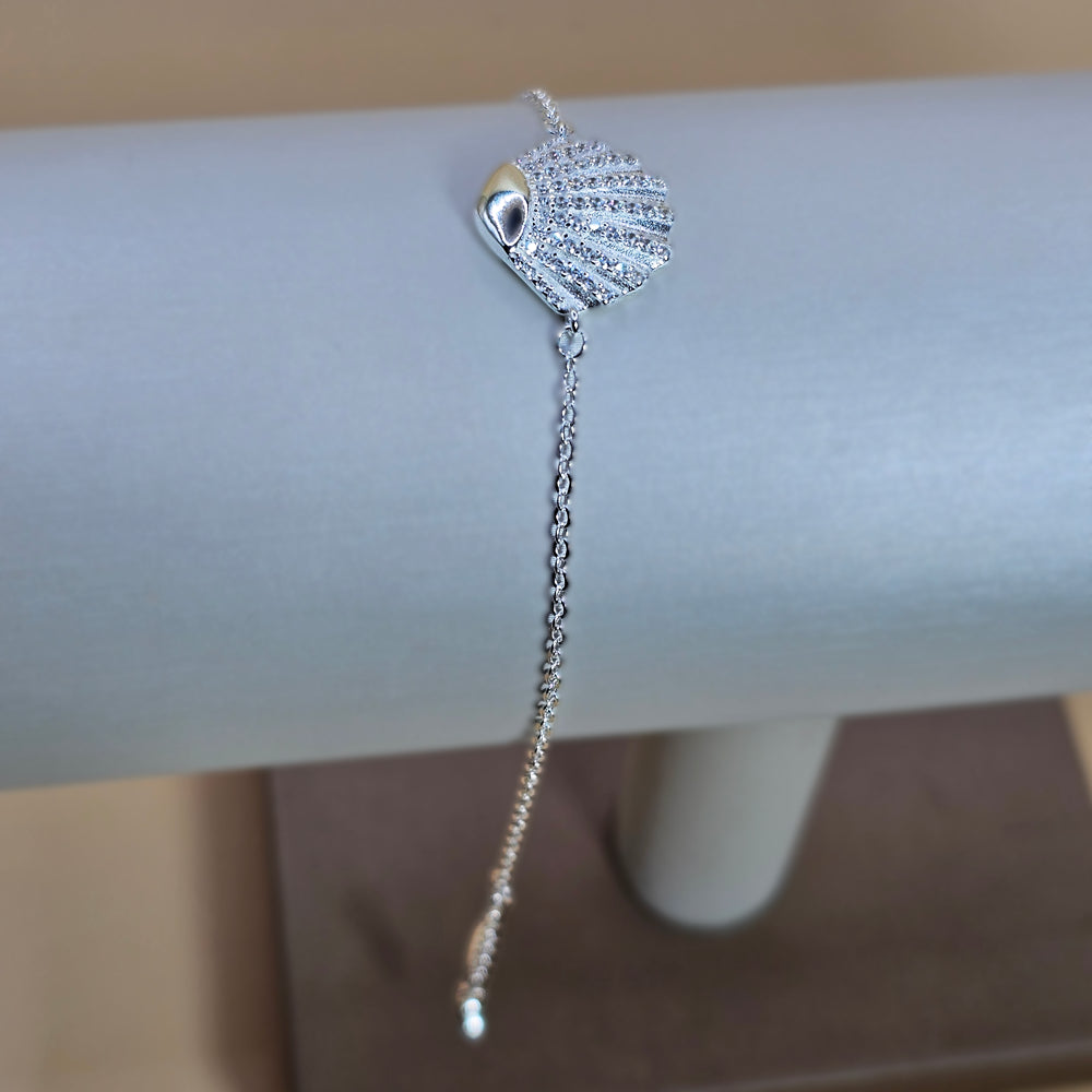 Pulsera de plata 925 con delicada cadena y colgante en forma de concha marina, finamente trabajada con textura y brillo que refleja la luz de manera elegante. Una joya fresca y sofisticada, ideal para aportar un toque marino y femenino a cualquier look.