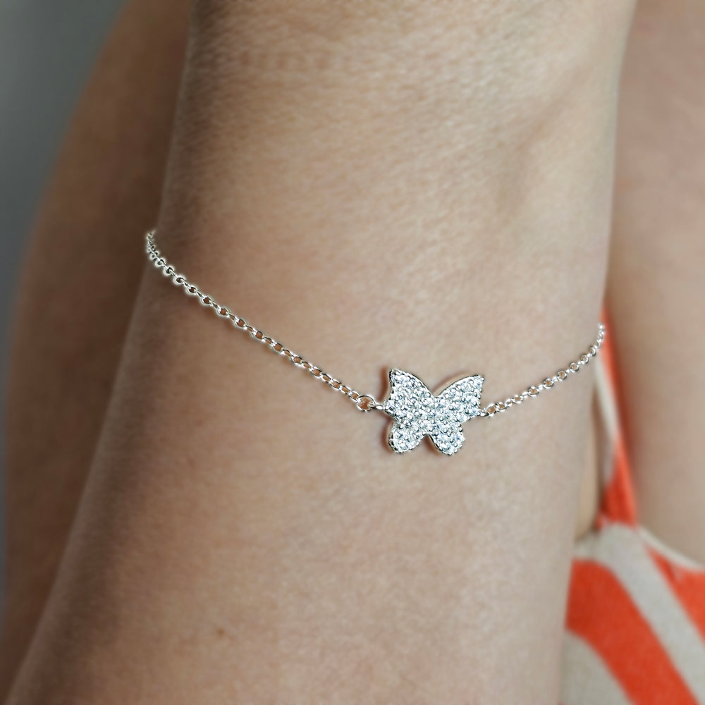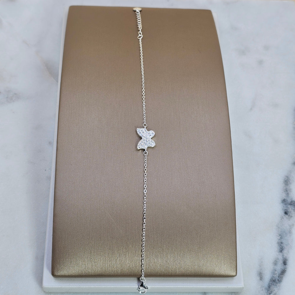 Pulsera de plata 925 con delicada cadena y colgante de mariposa, finamente adornado con brillantes circones que aportan un destello elegante y femenino. Una joya delicada y sofisticada, ideal para realzar cualquier look con un toque de luz y encanto.