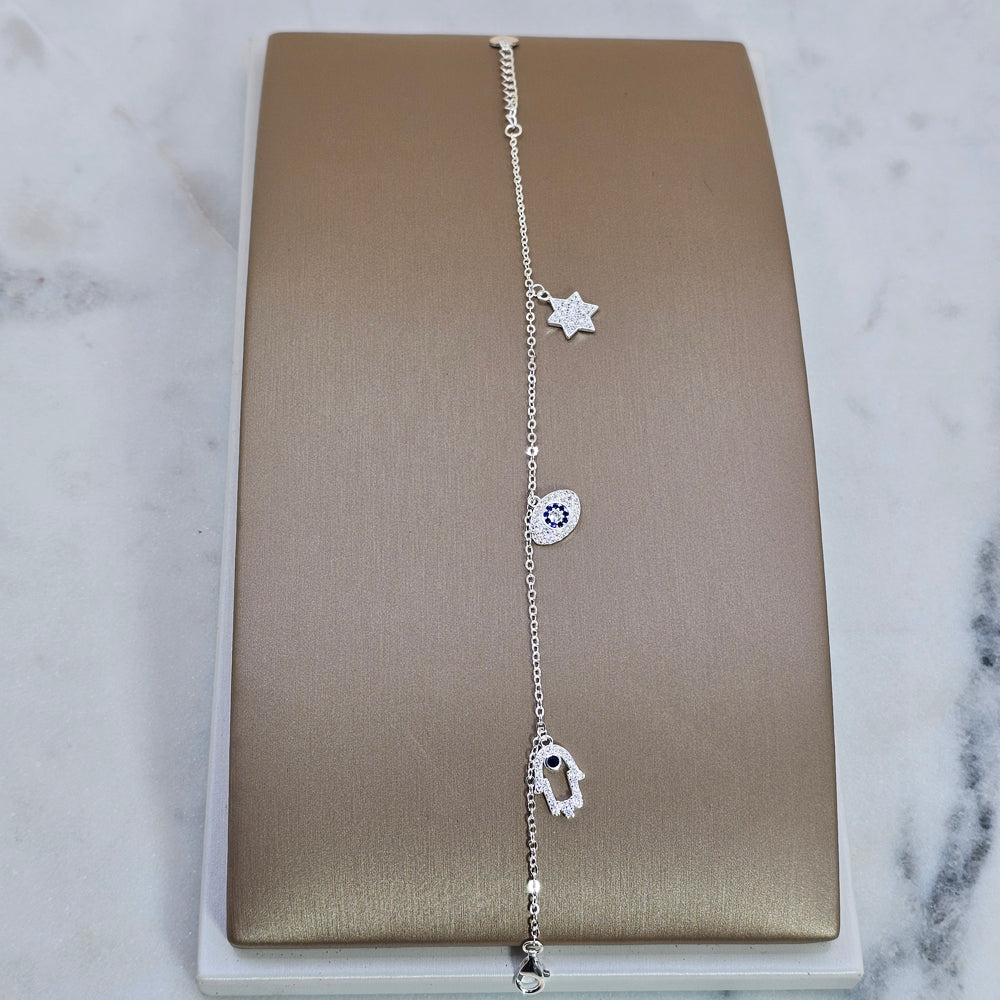 Pulsera de plata 925 con delicada cadena y finos detalles colgantes, que combinan un elegante ojo protector, mano de fatima y una estrella, delicadamente adornados con circones que aportan un sutil brillo. Una joya moderna y simbólica, ideal para usar a diario y sumar protección y estilo a cualquier look.