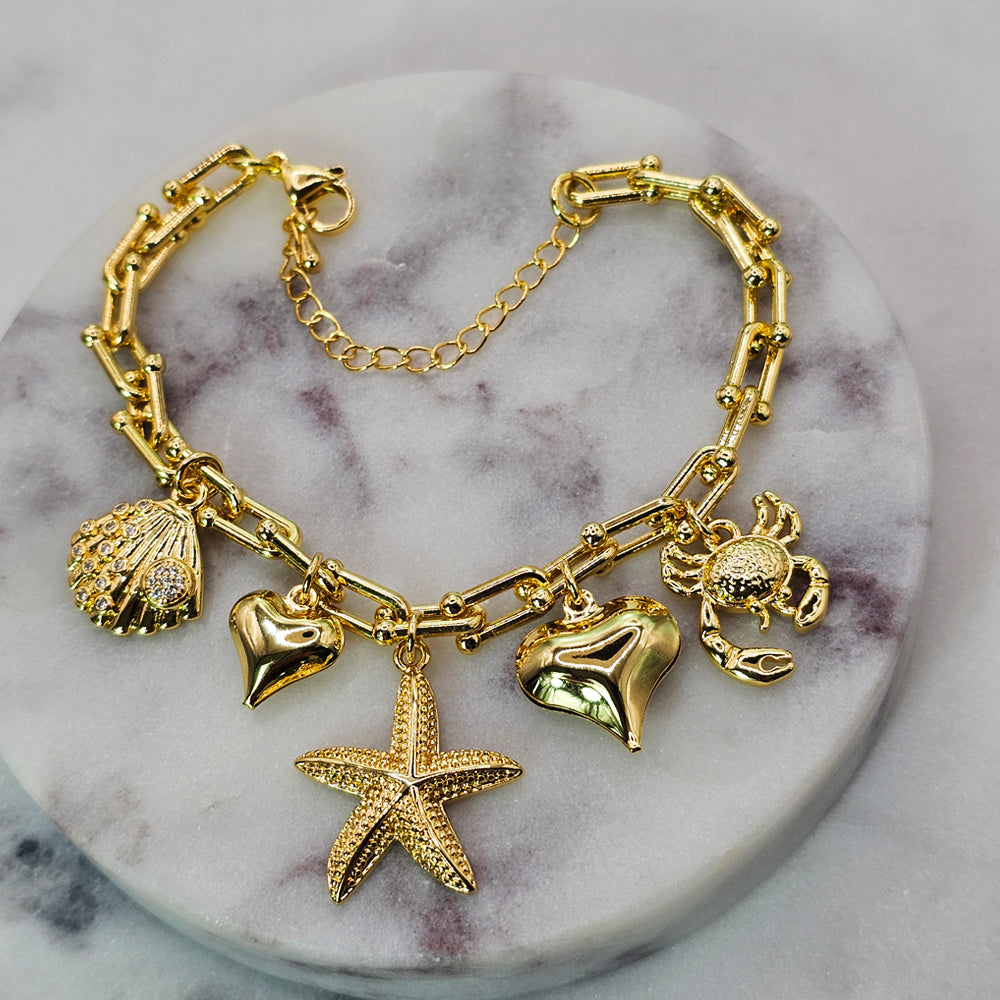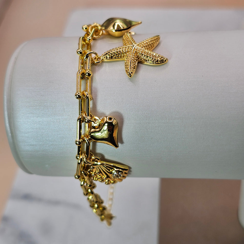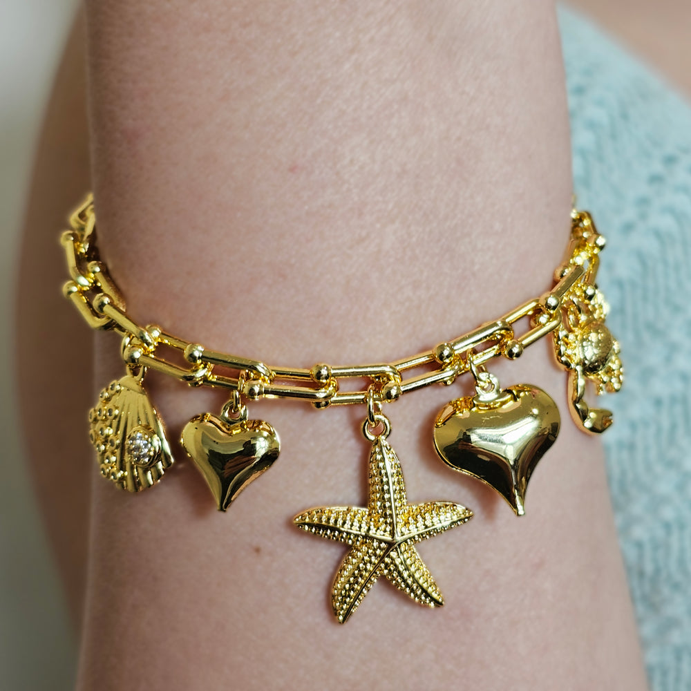 Pulsera bañada en oro con charms de corazones combinados con delicados adornos marinos, todos finamente decorados con circones. Una pieza elegante y luminosa que une el encanto del mar con un toque de sofisticación.
