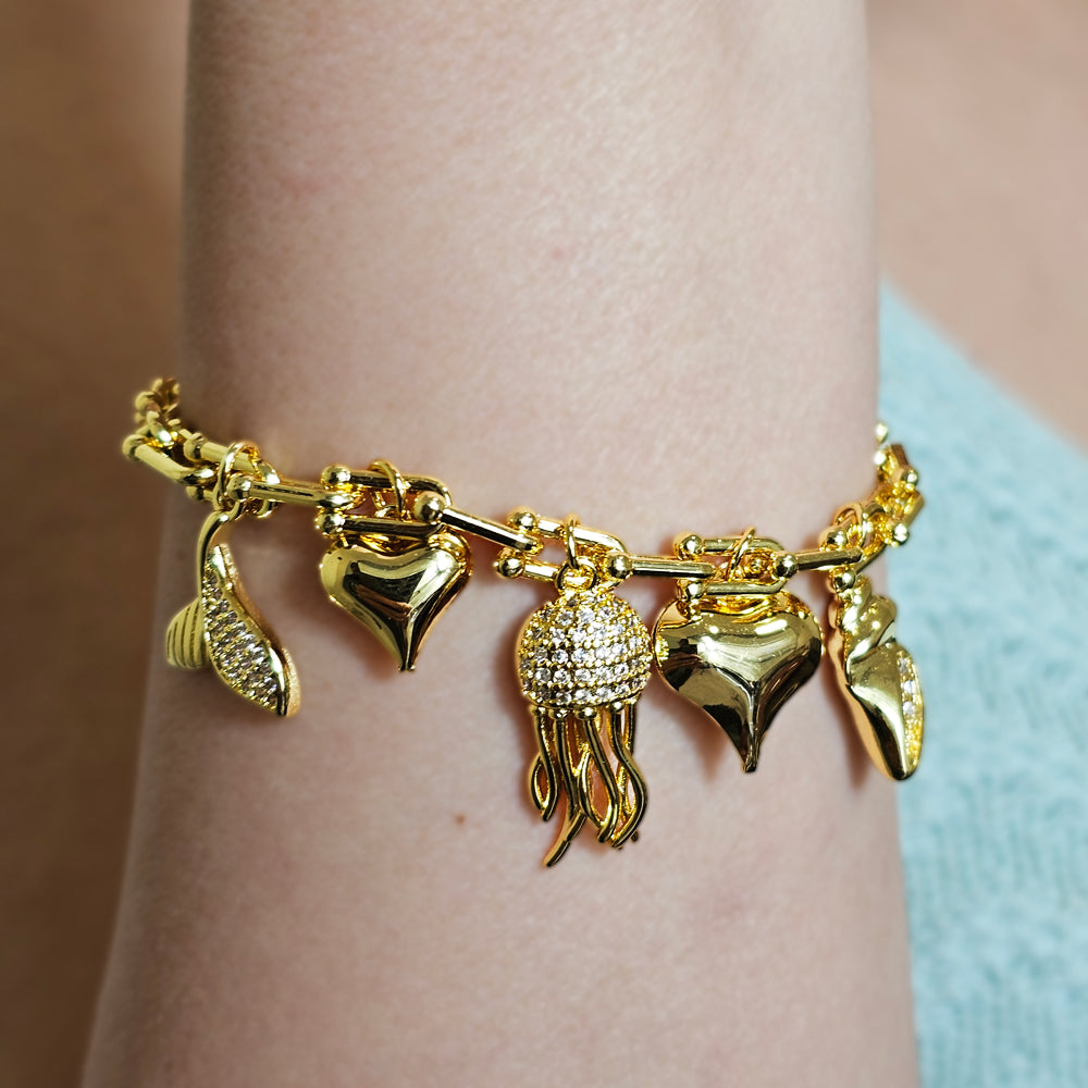 Pulsera bañada en oro con charms de corazones combinados con encantadores adornos de cola de sirena, pulpo y caracola, realzados con finos cristales. Un diseño elegante y original que fusiona brillo, fantasía y estilo marino.