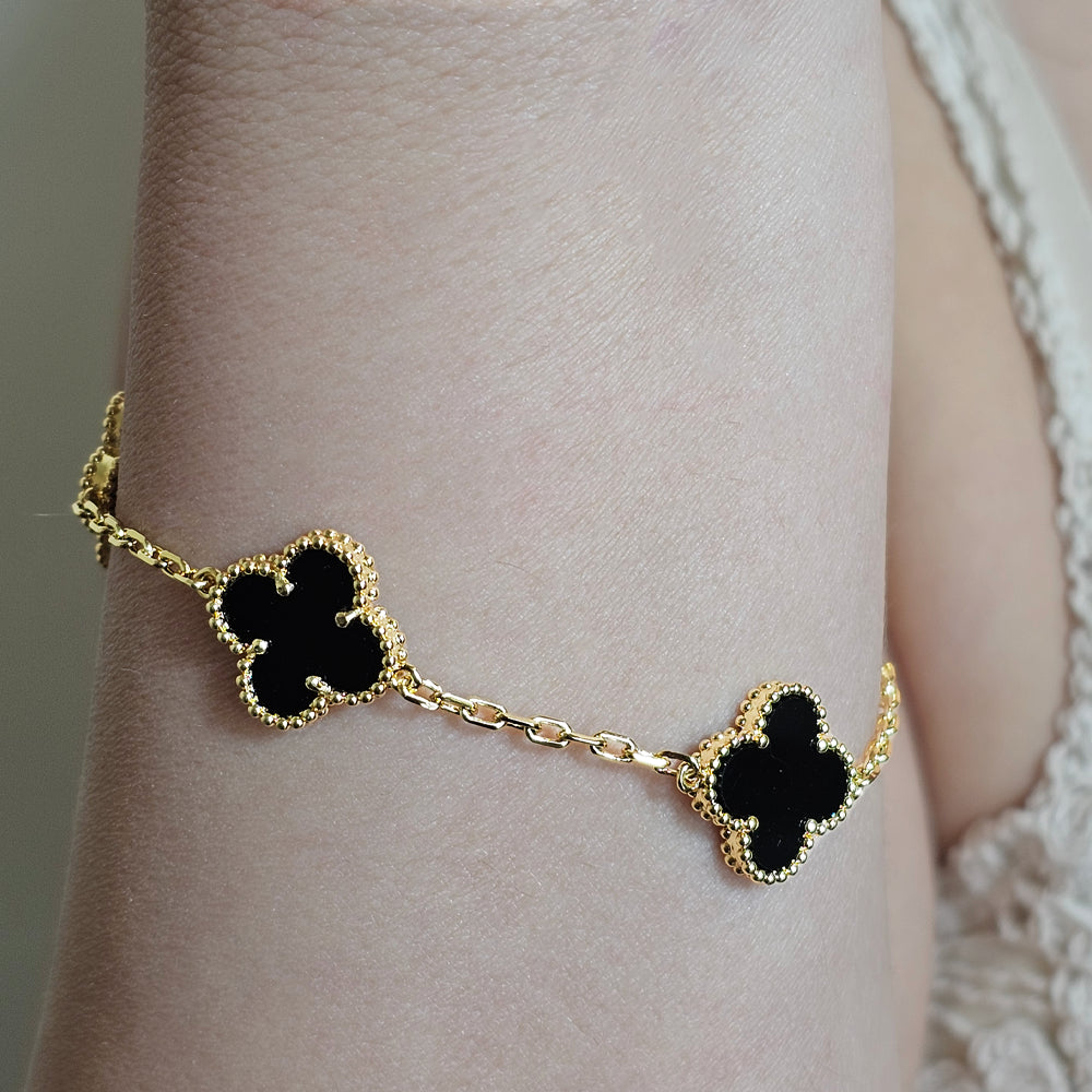 Pulsera bañada en oro, realzada con delicados detalles de flores en color negro que aportan un contraste sofisticado y moderno. Una joya femenina y distintiva, perfecta para lucir con elegancia en cualquier ocasión.
