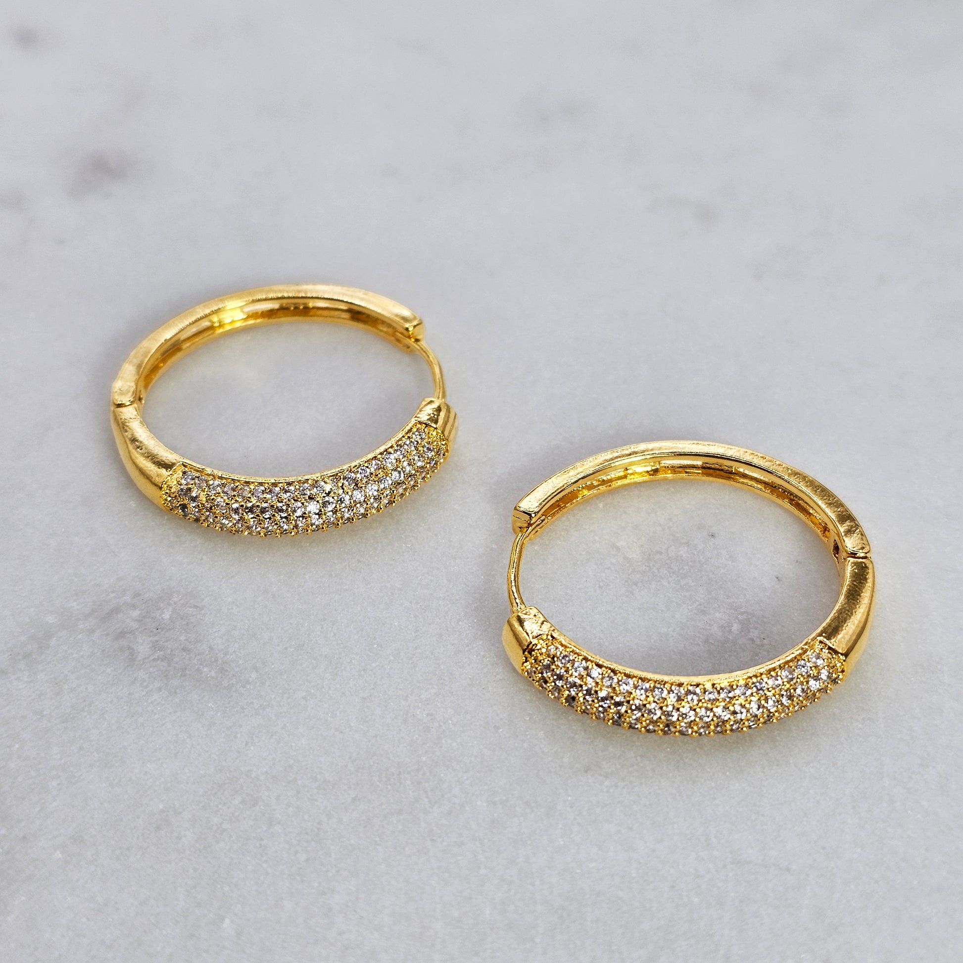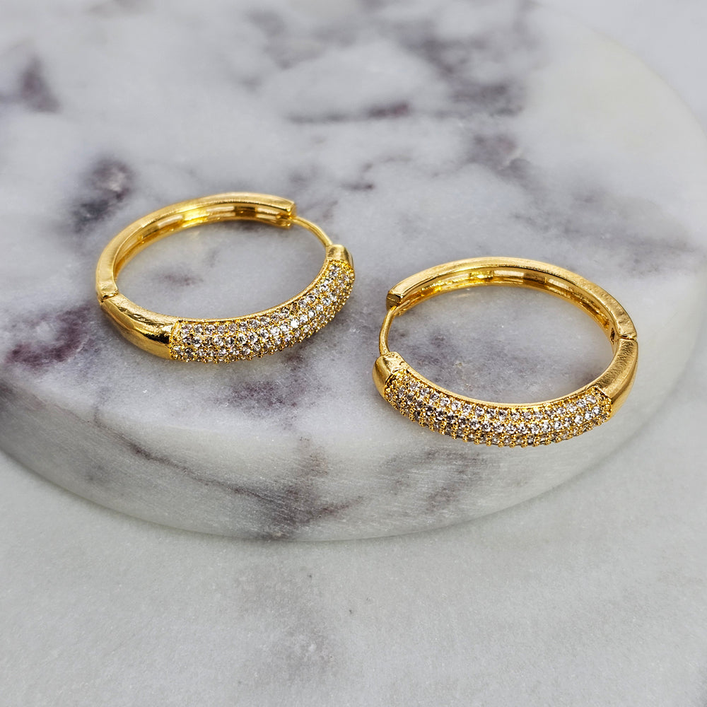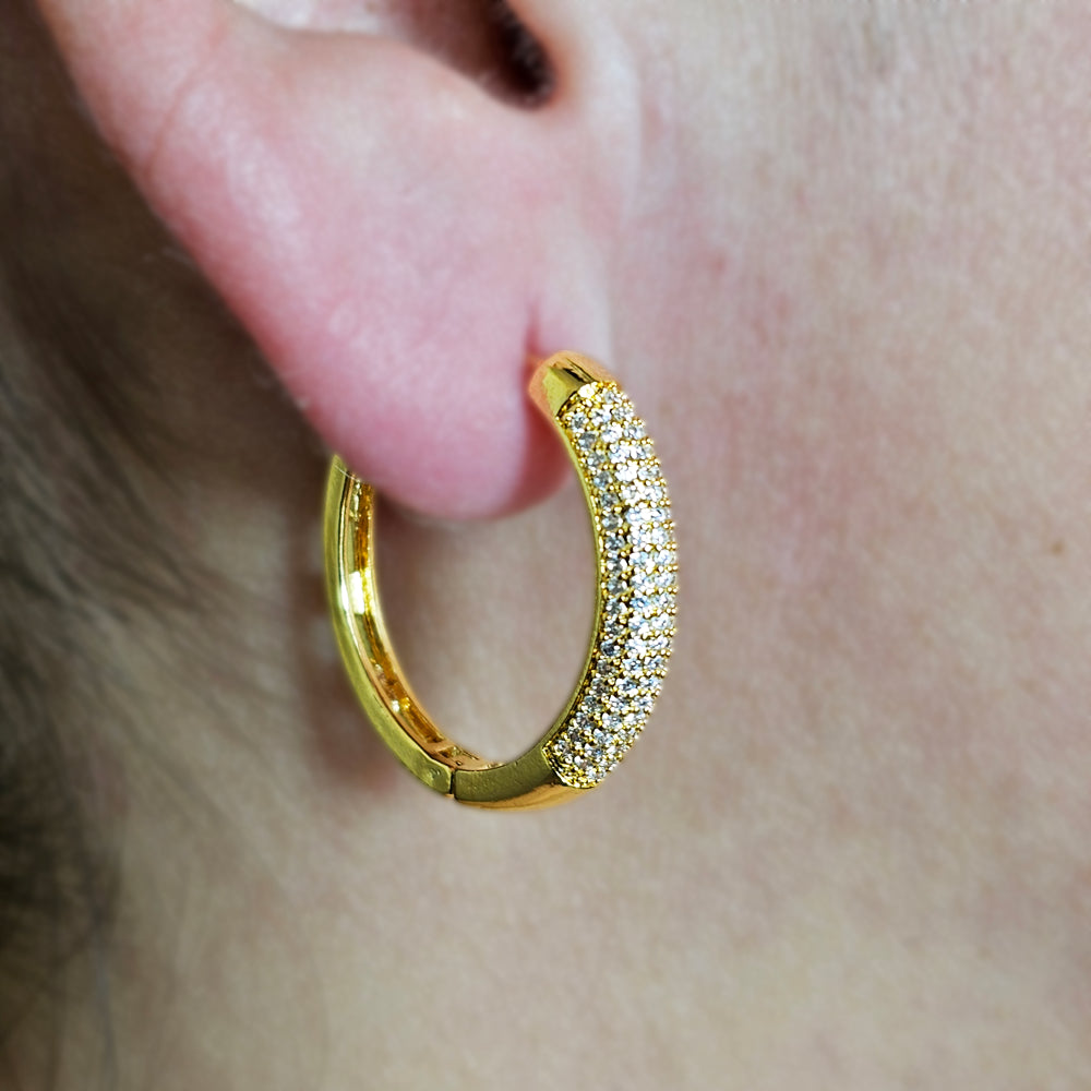 Aro bañado en oro con diseño curvo y acabado pavé de cristales, que aporta un brillo uniforme y sofisticado. Una pieza moderna y refinada, ideal para elevar cualquier look con un toque de elegancia y luminosidad.