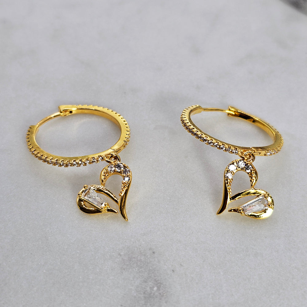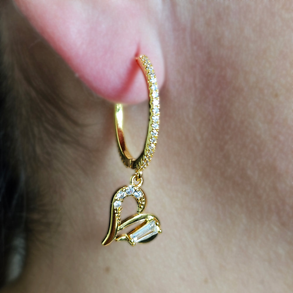 Aro bañado en oro con argolla fina engastada en cristales, acompañado de un delicado colgante en forma de corazón también adornado con destellos brillantes. Una pieza romántica y luminosa, perfecta para añadir un toque de dulzura y elegancia a cualquier look.