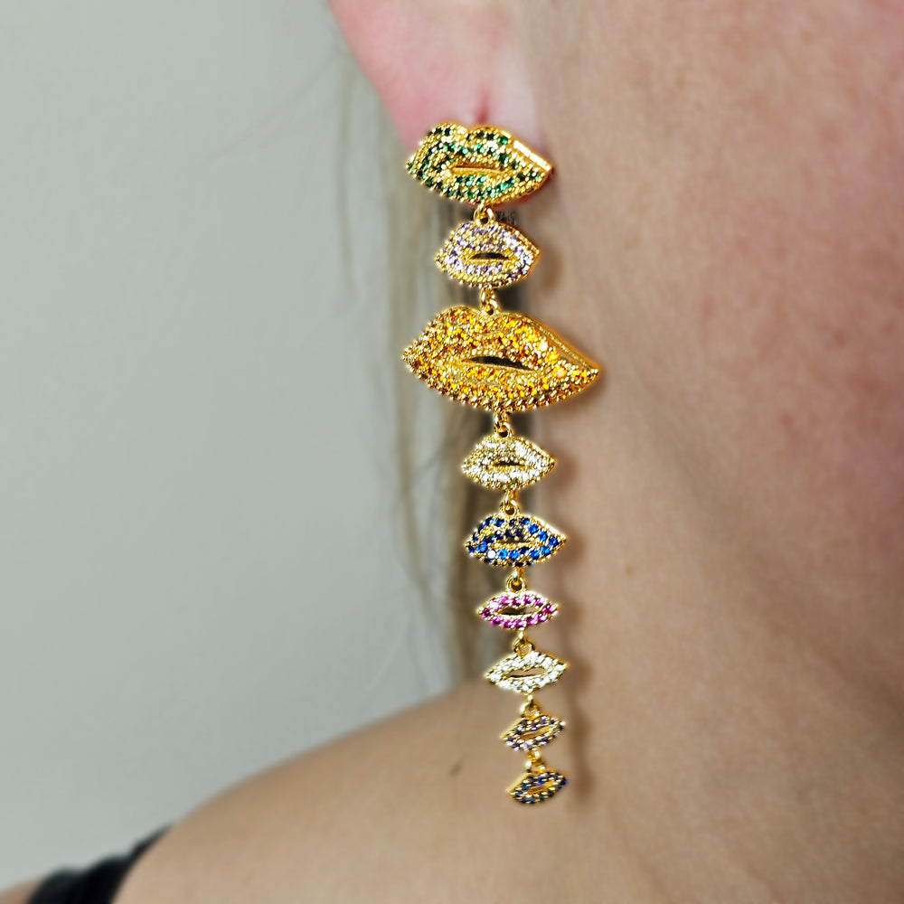 Aros bañados en oro con divertido diseño de labios en cascada, desigual, cada uno incrustado con cristales de colores que aportan brillo y estilo. Una pieza única, juvenil y atrevida, ideal para quienes buscan accesorios con personalidad y un toque chic.