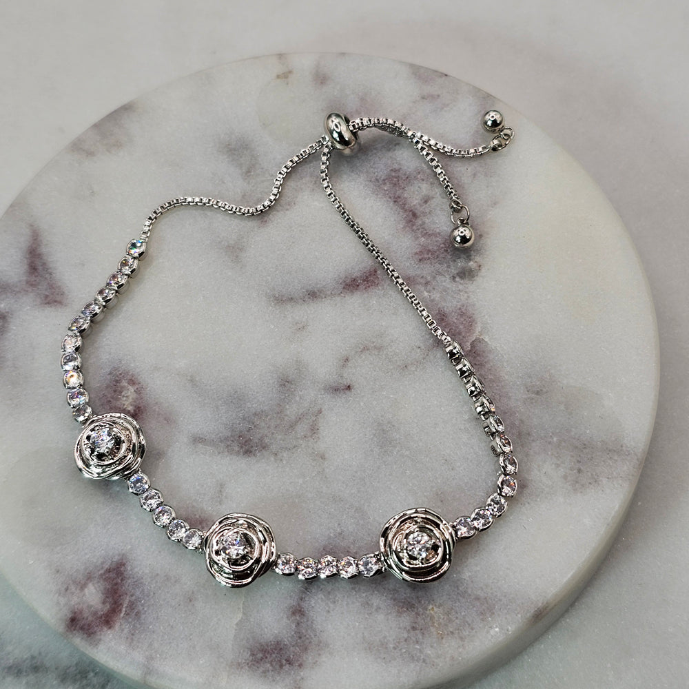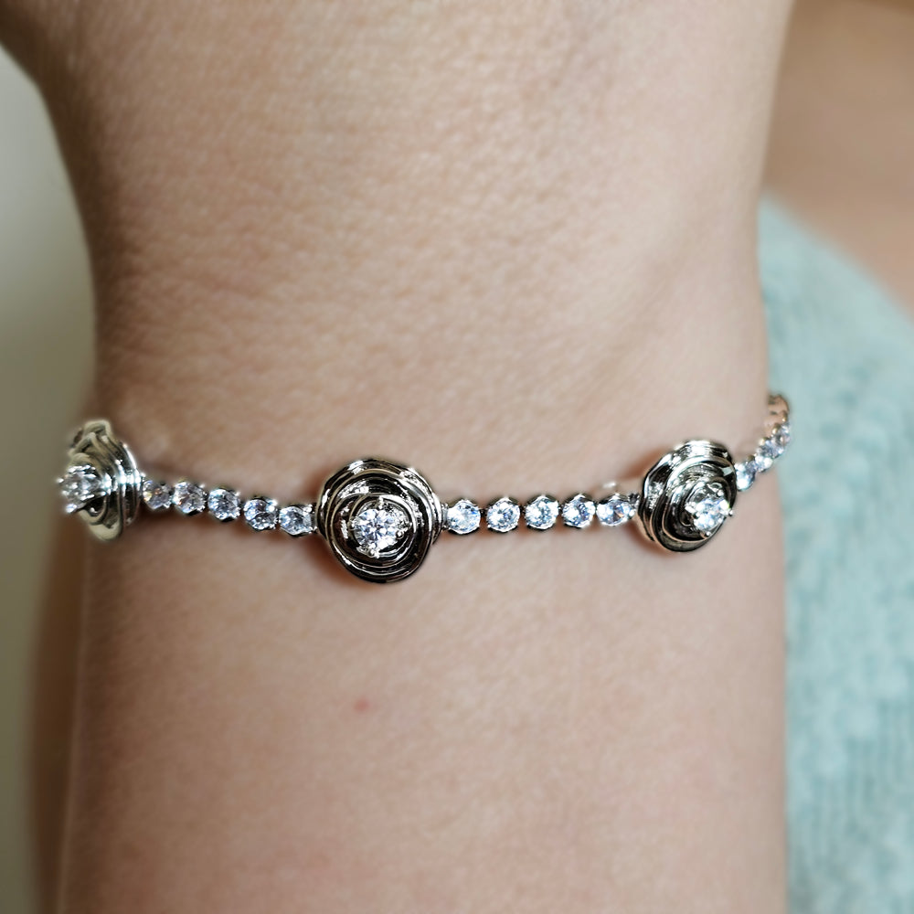 Pulsera bañada en plata rodinada con fina cinta de pequeños cristales y delicados dijes en forma de rosa con un cristal en su centro. Un diseño elegante y luminoso que evoca feminidad y sofisticación.