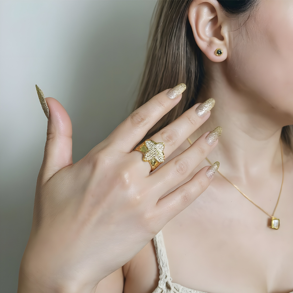 Anillo bañado en oro, de diseño ajustable con estructura cuadrada que enmarca un delicado trébol en el centro, finamente realzado con pequeños cristales que aportan brillo y distinción. Una joya sofisticada y femenina, perfecta para realzar cualquier look con un toque de elegancia y encanto. Cuidados especiales