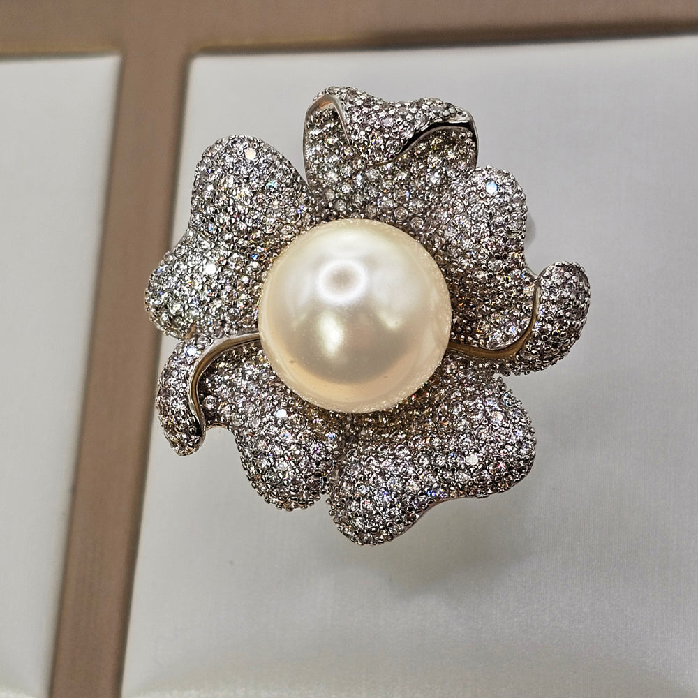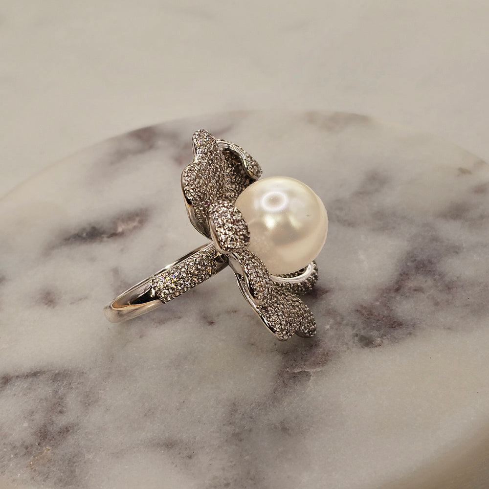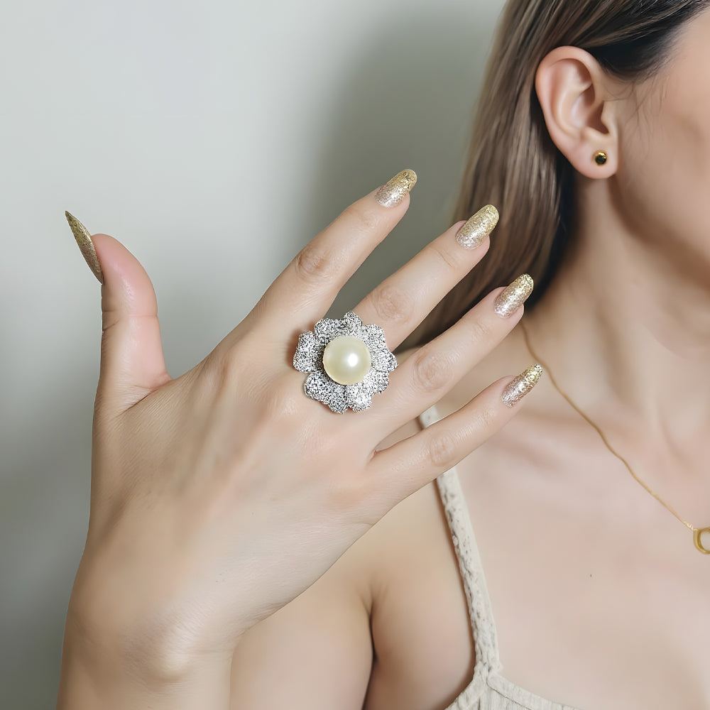 Anillo Baño de Plata Rodinada Austriaco Flor Perla