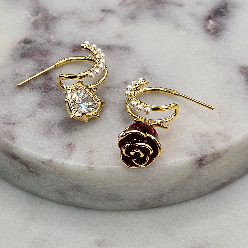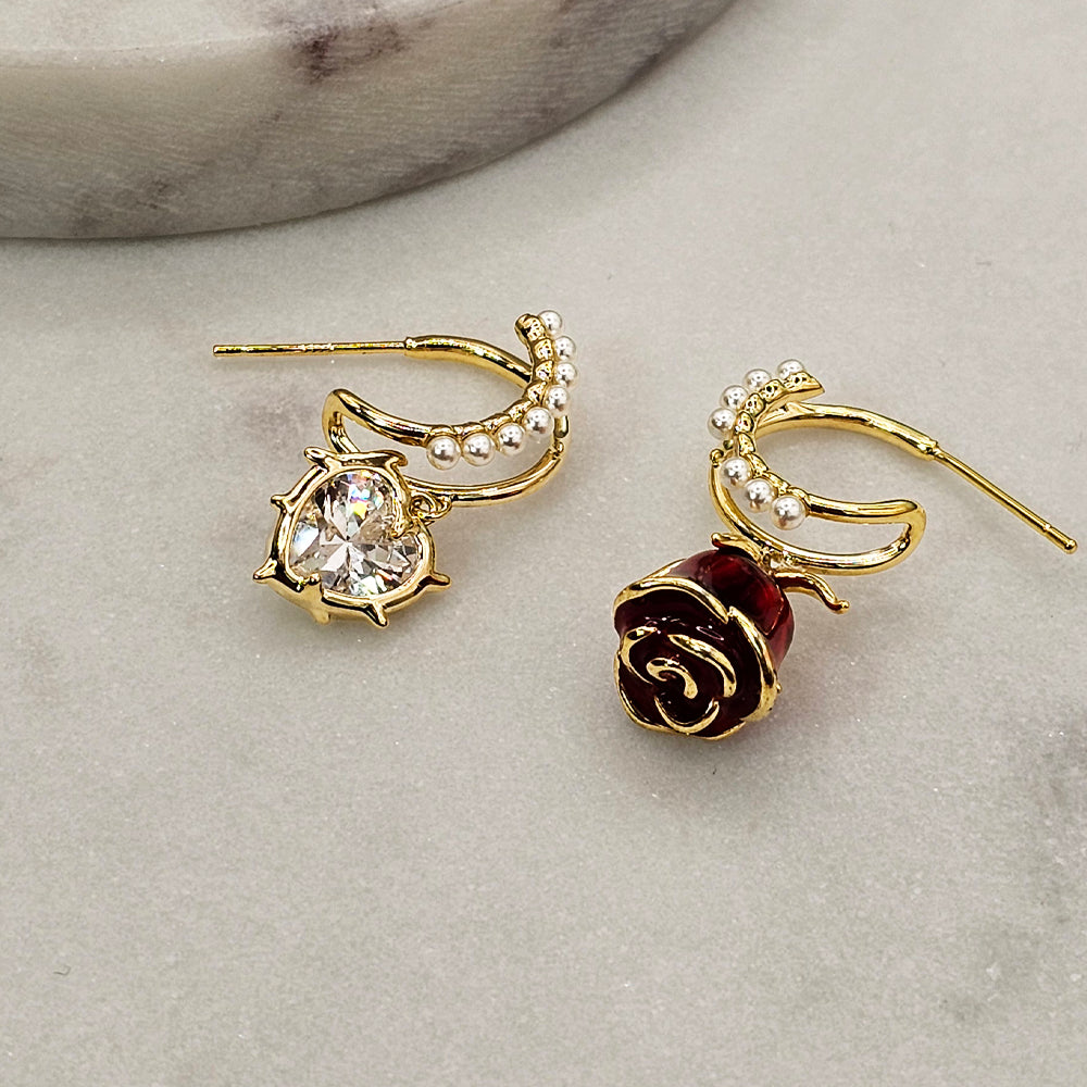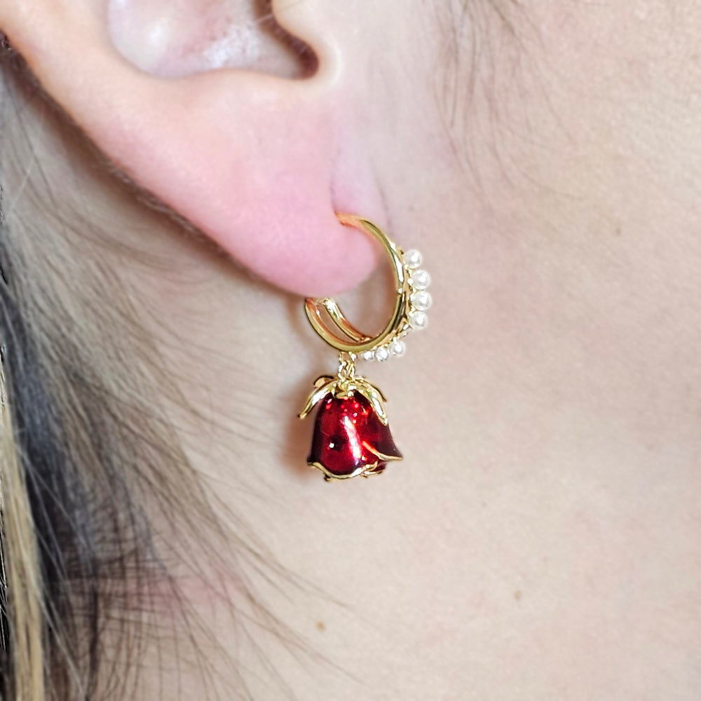 Delicados y románticos, estos aros bañados en oro combinan la pureza de las perlas de río con la pasión de una rosa roja y el brillo etéreo de un corazón de cristal blanco. Una joya que envuelve cada mirada en elegancia y amor eterno.