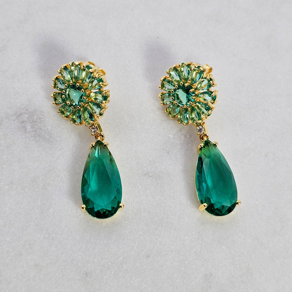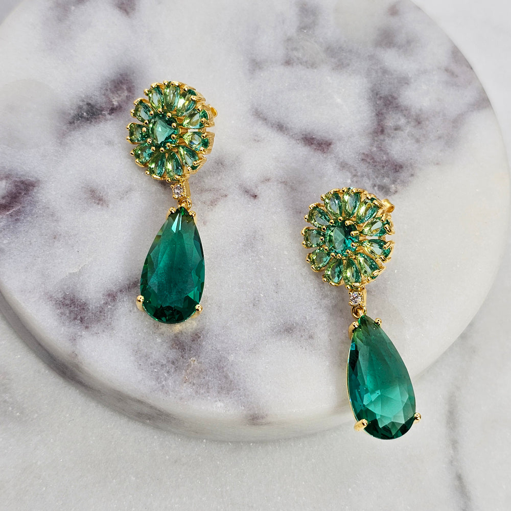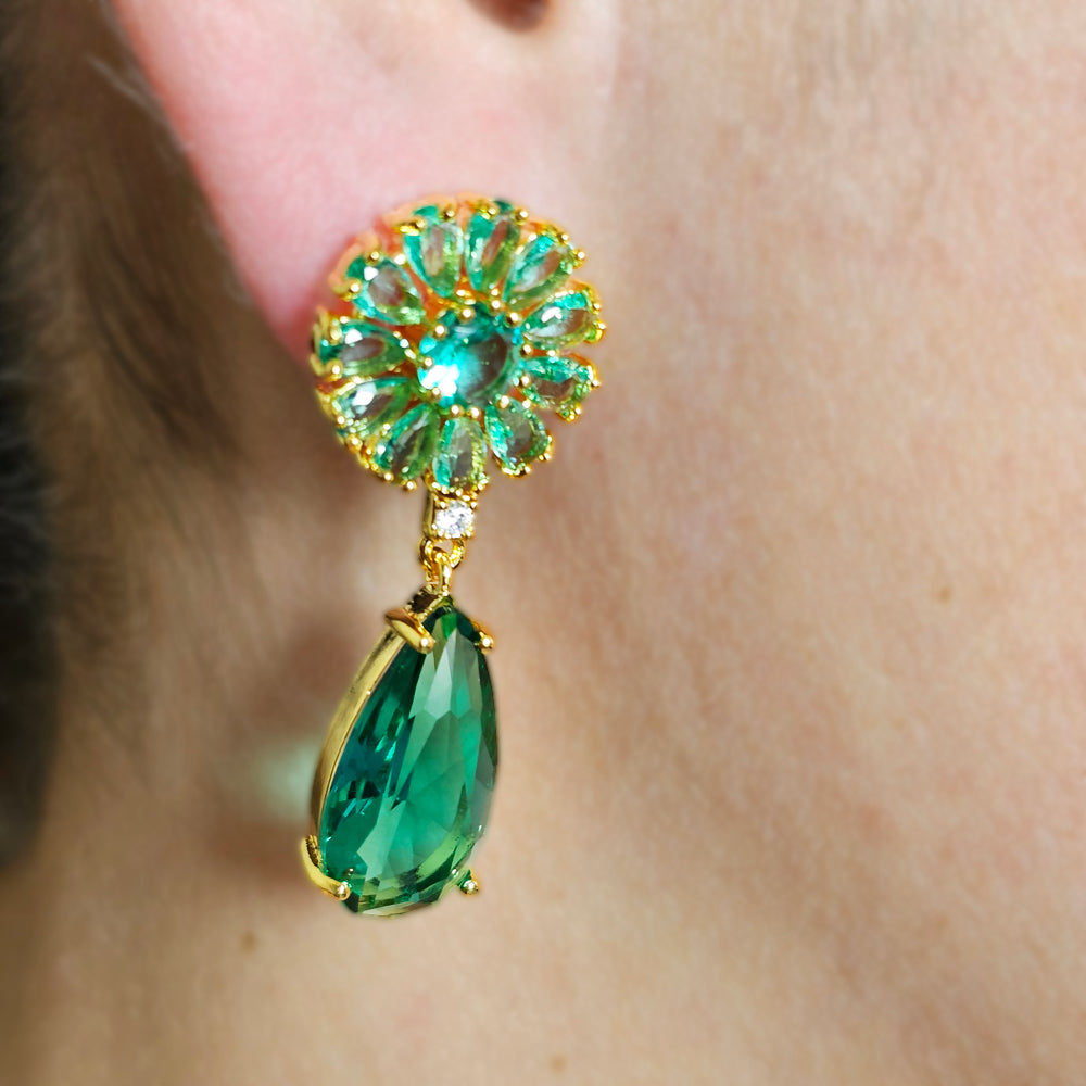 Aro bañado en oro con diseño de flor central y gota esmeralda Elegante y lleno de brillo, este aro destaca por su flor circular de cristales verdes cuidadosamente engarzados y su delicada gota estilo esmeralda que aporta movimiento y sofisticación. Una pieza luminosa y femenina, perfecta para dar un toque de distinción a cualquier look. Ideal para ocasiones especiales o para realzar tu estilo diario.