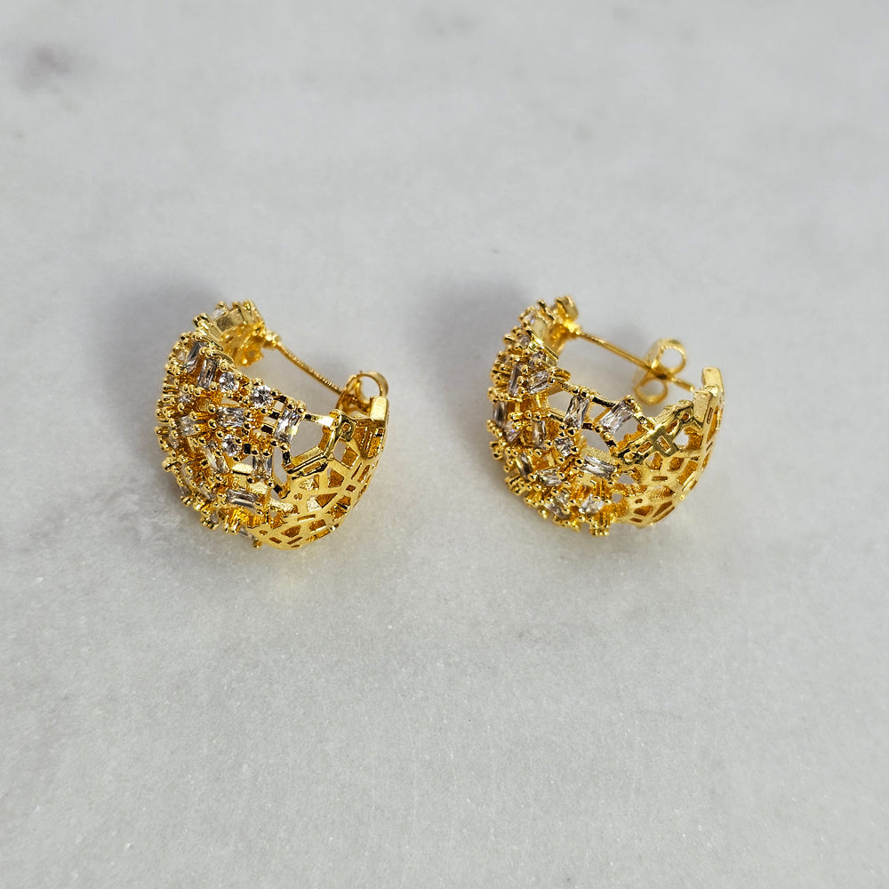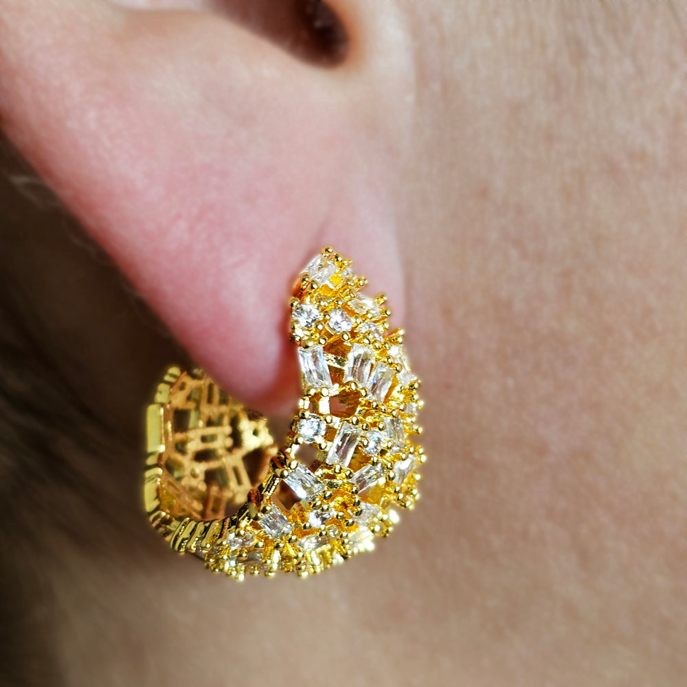Aro bañado en oro de diseño ancho y elegante, completamente recubierto de finos cristales que aportan un brillo intenso desde cada ángulo. Su estilo entramado crea un efecto lujoso y sofisticado, ideal para elevar cualquier look de día o de noche. Una pieza llamativa, moderna y perfecta para quienes buscan un accesorio lleno de luz y glamour.