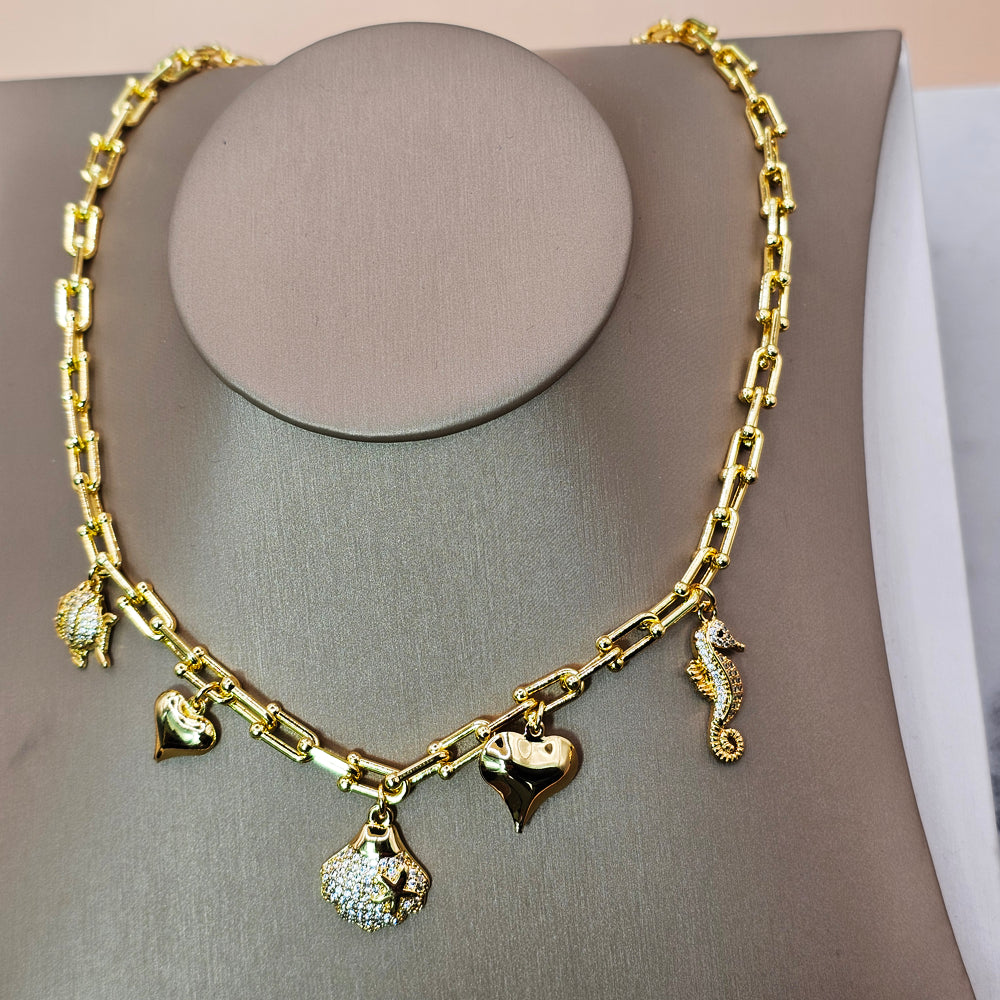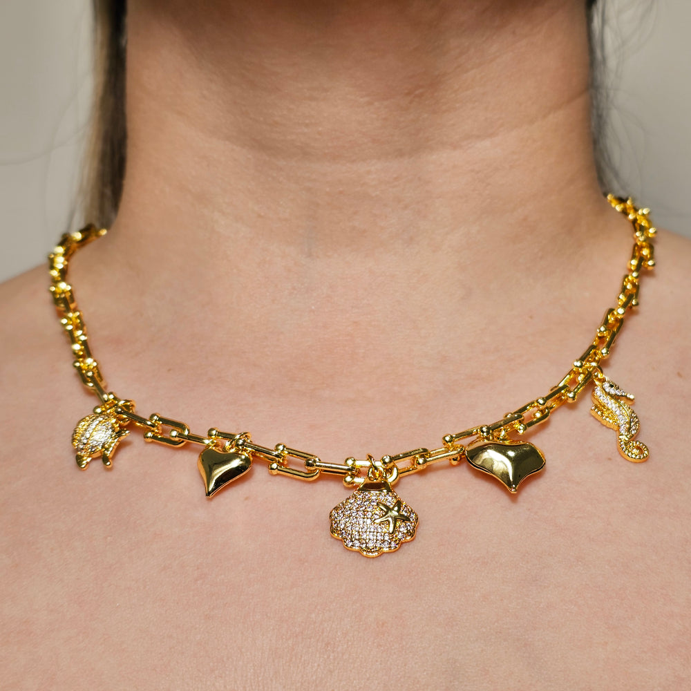 Sofisticado collar bañado en oro, realzado con encantadores charms marinos adornados con finos cristales. Una pieza elegante y luminosa que evoca la frescura y el encanto del mar.