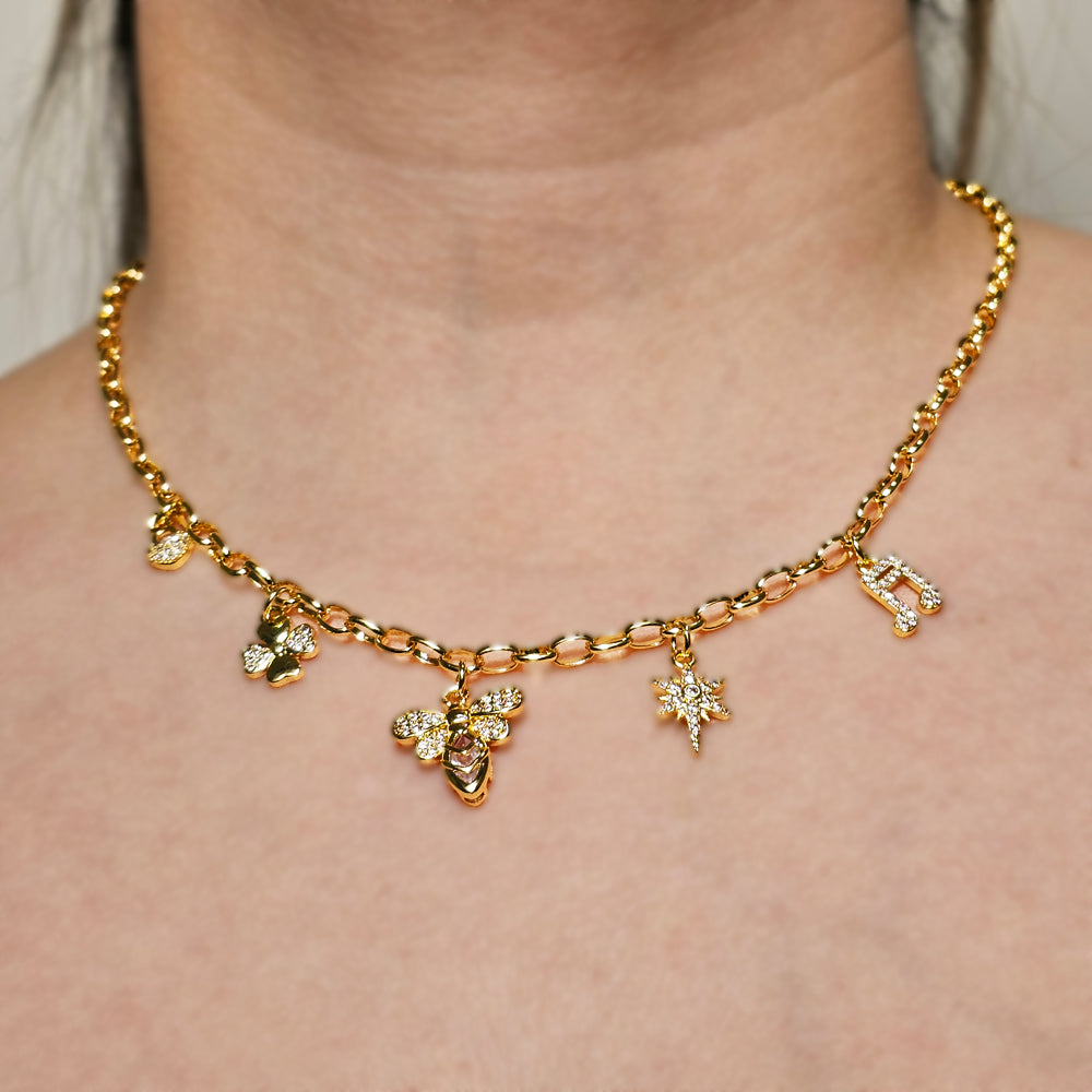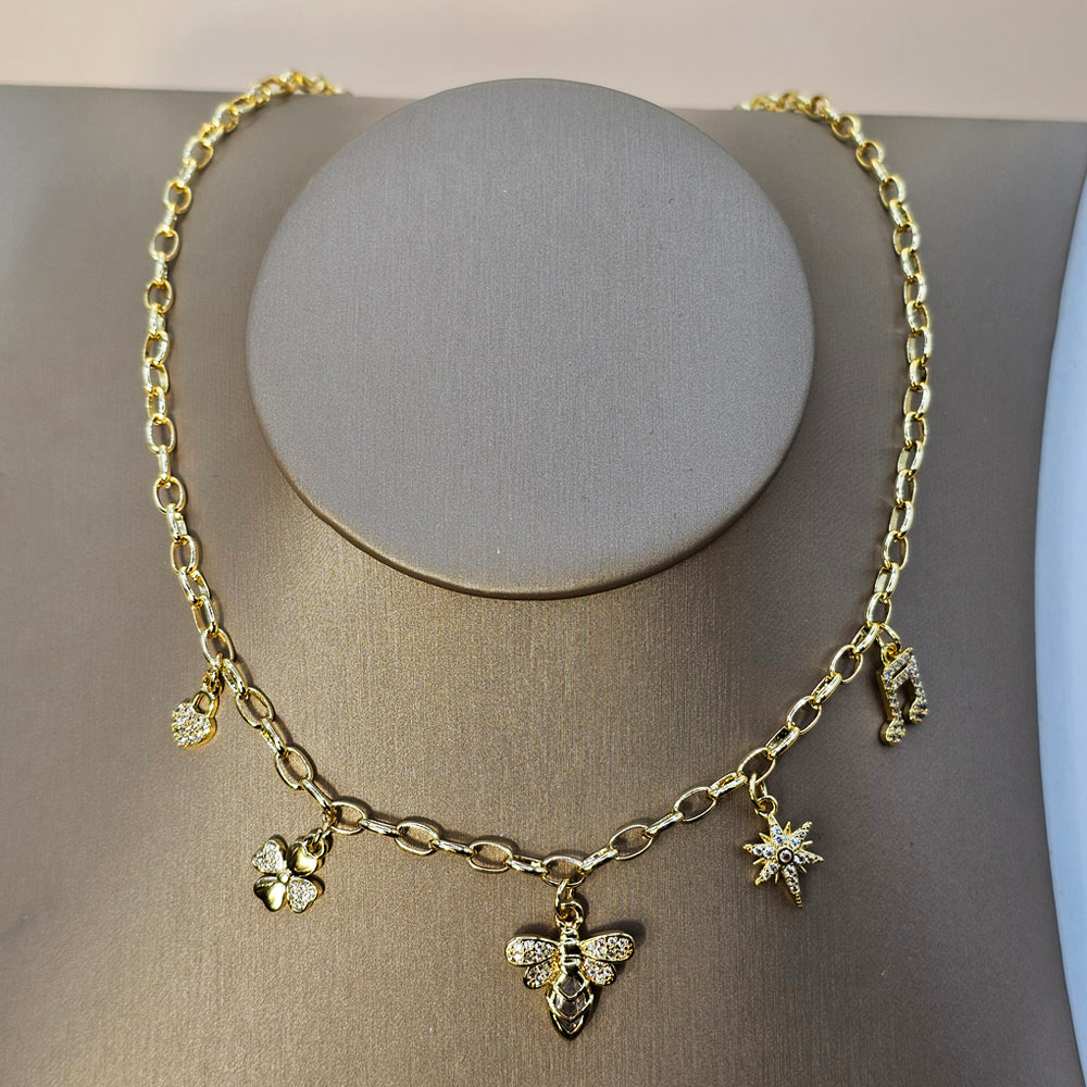 Sofisticado collar bañado en oro, con delicada cadena y charms variados, como una delicada luciérnaga, trébol, nota musical, estrella fugaz y candado, completamente adornados con finos circones. Una joya elegante que combina brillo, estilo y simbolismo refinado.