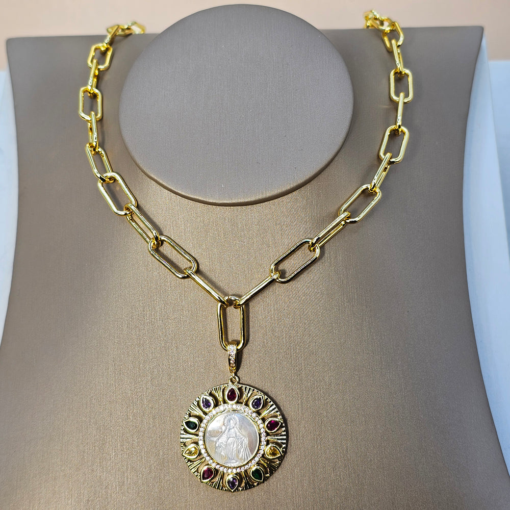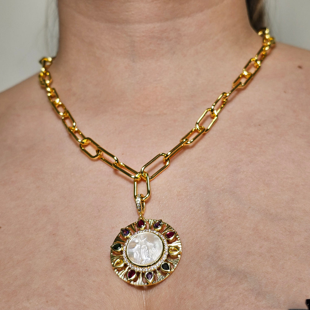 Sofisticado collar bañado en oro estilo Cartier, con colgante que presenta la silueta de una Virgen tallada en nácar, rodeada de finos circones y cristales de colores. Una joya elegante que combina espiritualidad, brillo y distinción atemporal.
