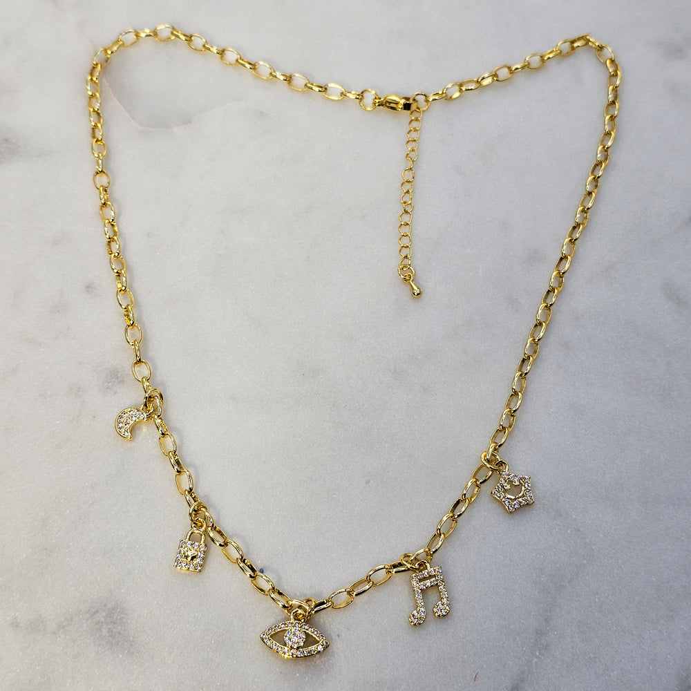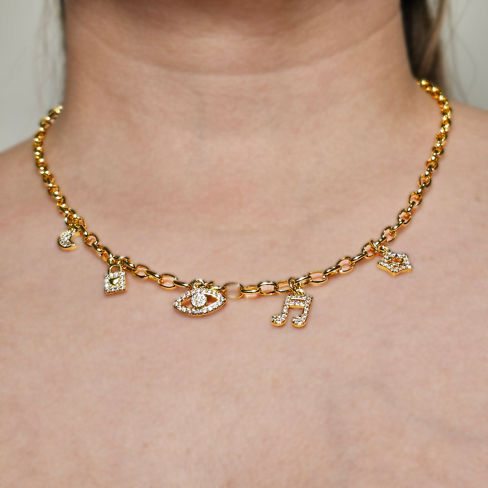 Elegante collar bañado en oro, con delicada cadena y charms variados, que simbolizan proteccion como, estrella, nota musical, ojo turco, candado y luna, completamente adornados con finos circones. Una joya sofisticada que combina brillo, estilo y simbolismo refinado.