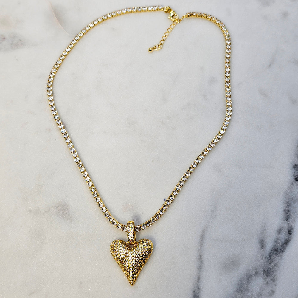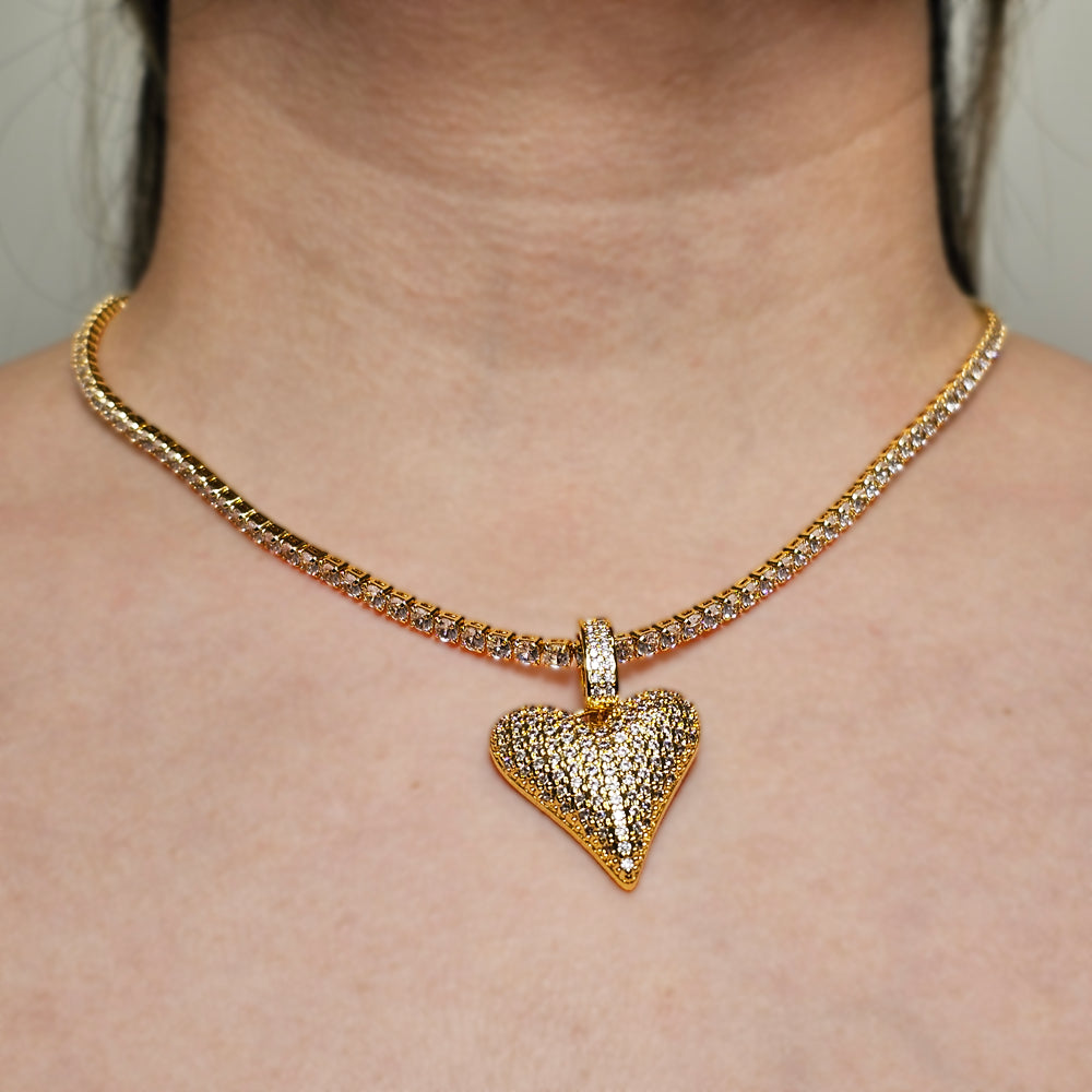 Sofisticado collar bañado en oro, cinta de circones que culmina en un elegante corazón completamente adornado con circones. Una joya brillante y refinada que irradia elegancia y distinción.
