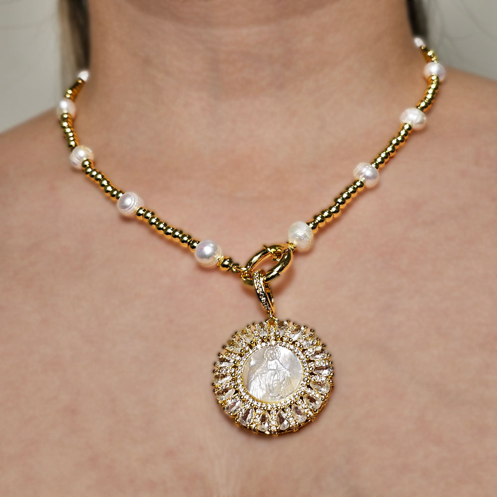 Refinado collar bañado en oro, con delicada cadena de esferas y perlas de río, realzado con un elegante colgante de motivo religioso tallado en nácar y adornado con cristales. Una pieza sofisticada que combina espiritualidad, brillo y distinción.