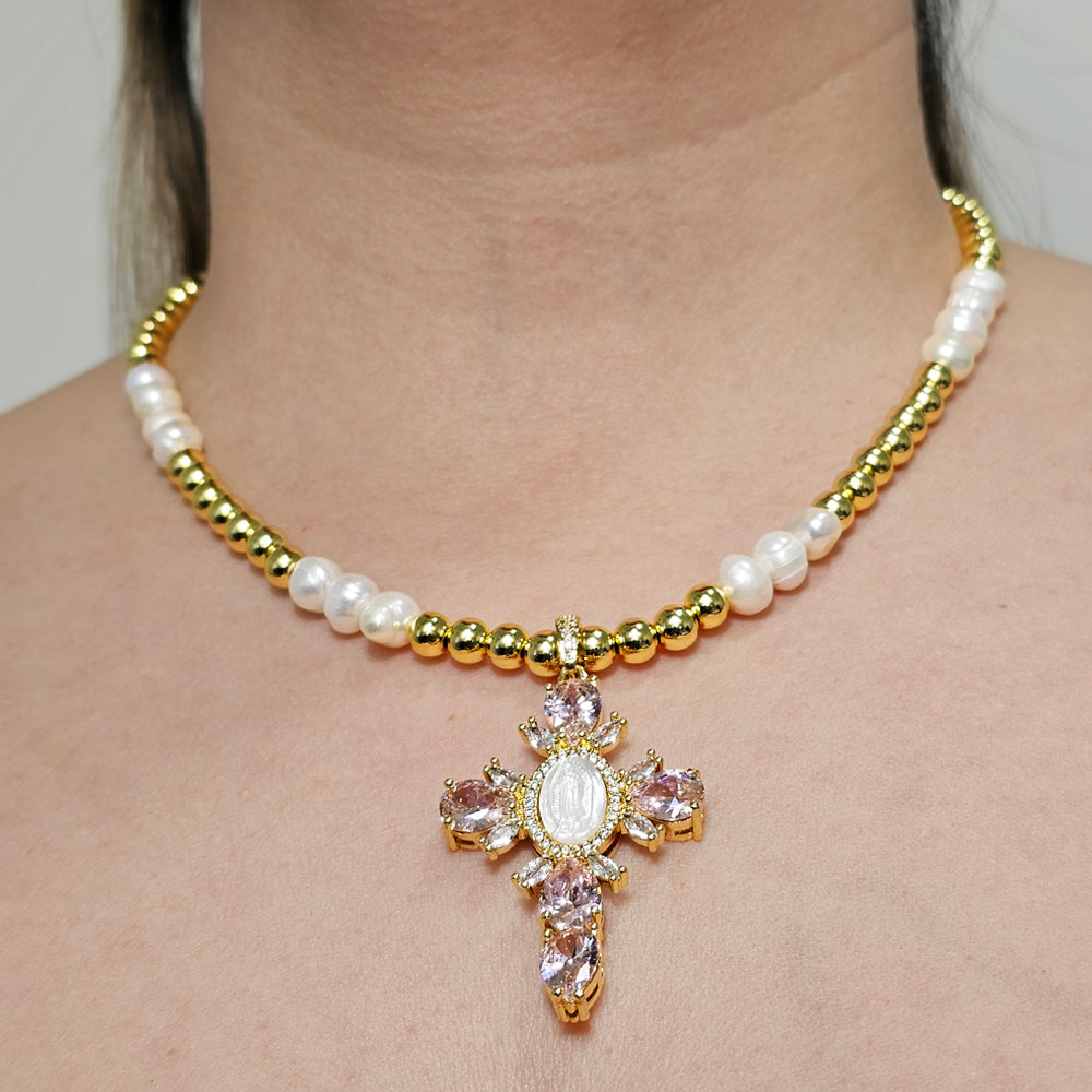 Elegante collar bañado en oro, con delicada cadena de esferas y perlas de río, realzado con un hermoso colgante de cruz con cristales rosados y una imagen religiosa en nácar en su centro. Una pieza sofisticada que combina espiritualidad, brillo y estilo atemporal.