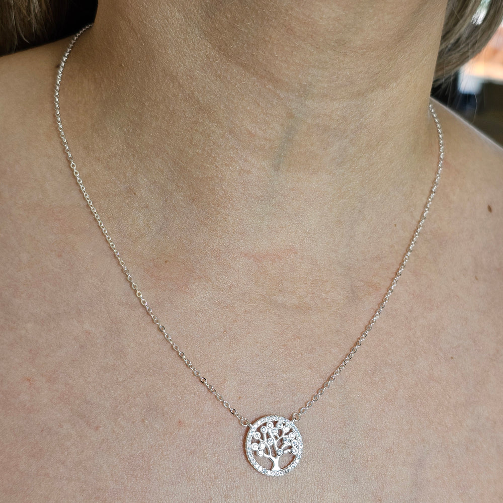 Collar de plata 925 con delicada cadena y colgante circular Árbol de la Vida, finamente trabajado y adornado con pequeños circones que aportan un brillo sutil. Una joya elegante y simbólica, ideal para representar equilibrio, crecimiento y conexión en cualquier ocasión.