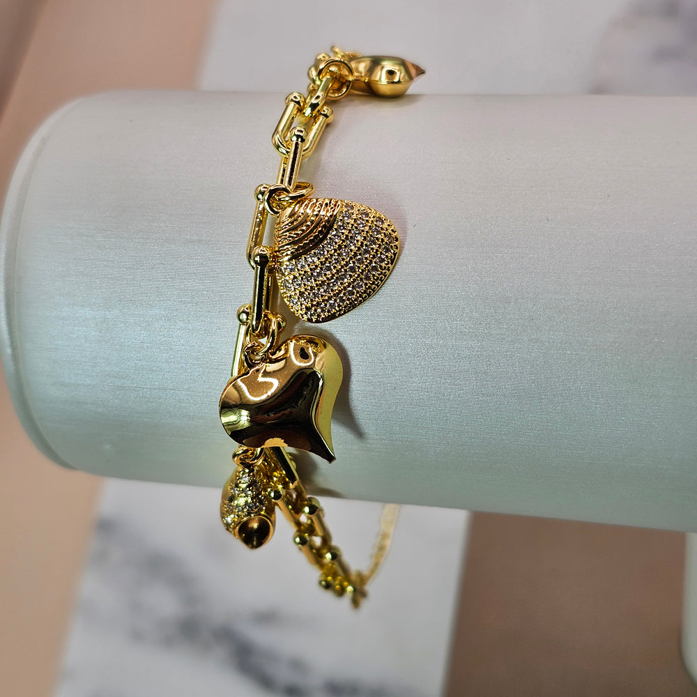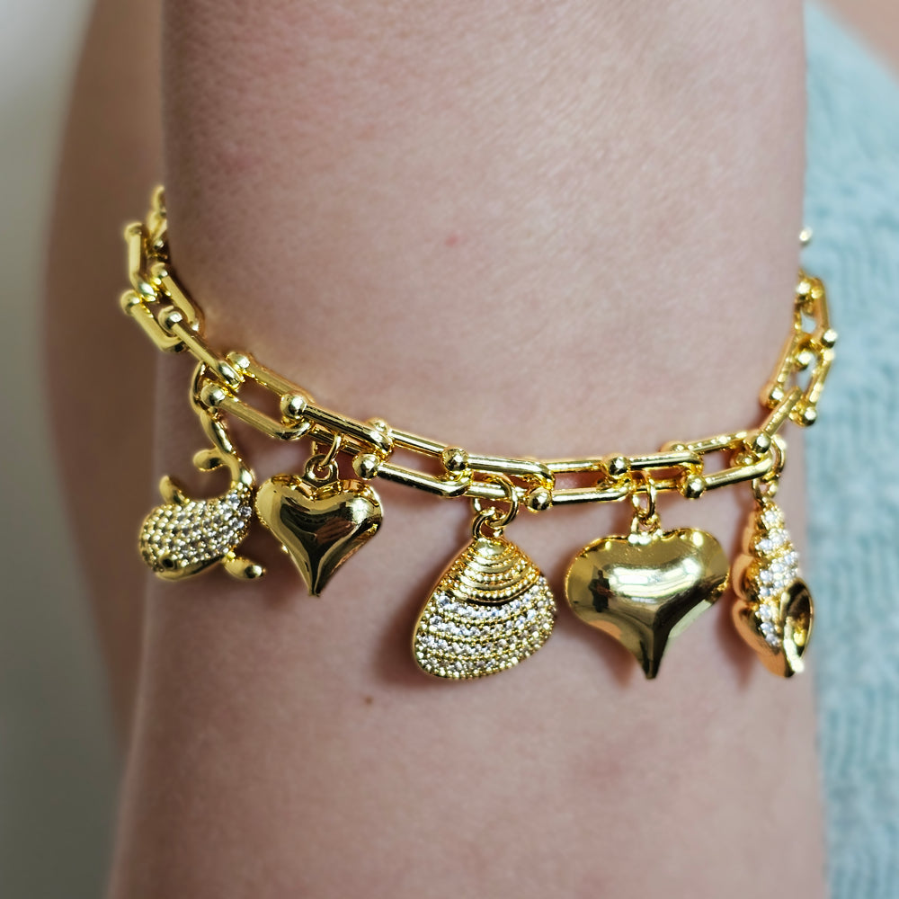 Pulsera bañada en oro con charm de corazón combinado con delicados diseños marinos de pez y caracolas. Una joya elegante y veraniega que evoca frescura, brillo y sofisticación.