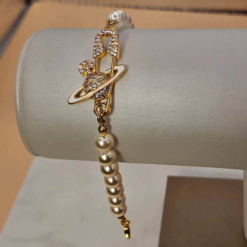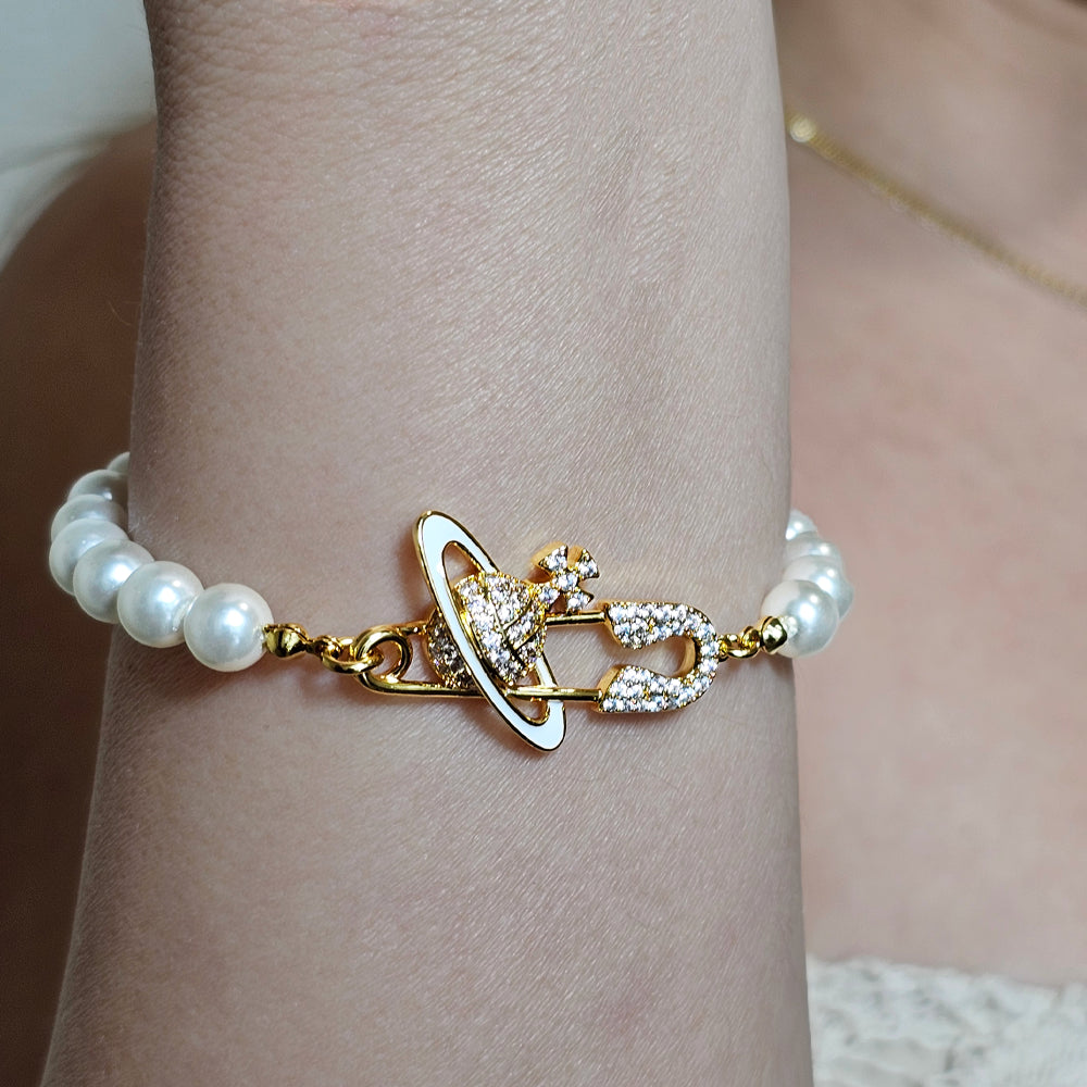 Pulsera bañada en oro con delicadas perlas que realzan su encanto clásico, acompañada de un colgante exclusivo en forma de planeta atravesado por un alfiler, finamente adornado con cristales que aportan destellos de luz y sofisticación. Una pieza única y moderna que combina elegancia y originalidad en un diseño atemporal.