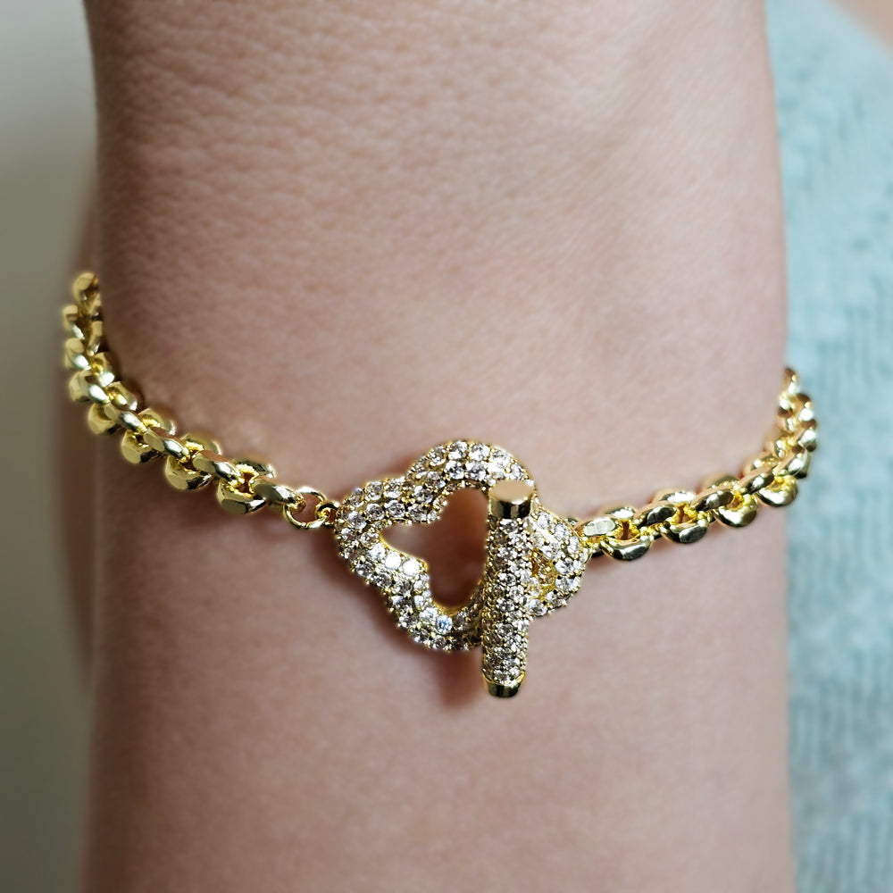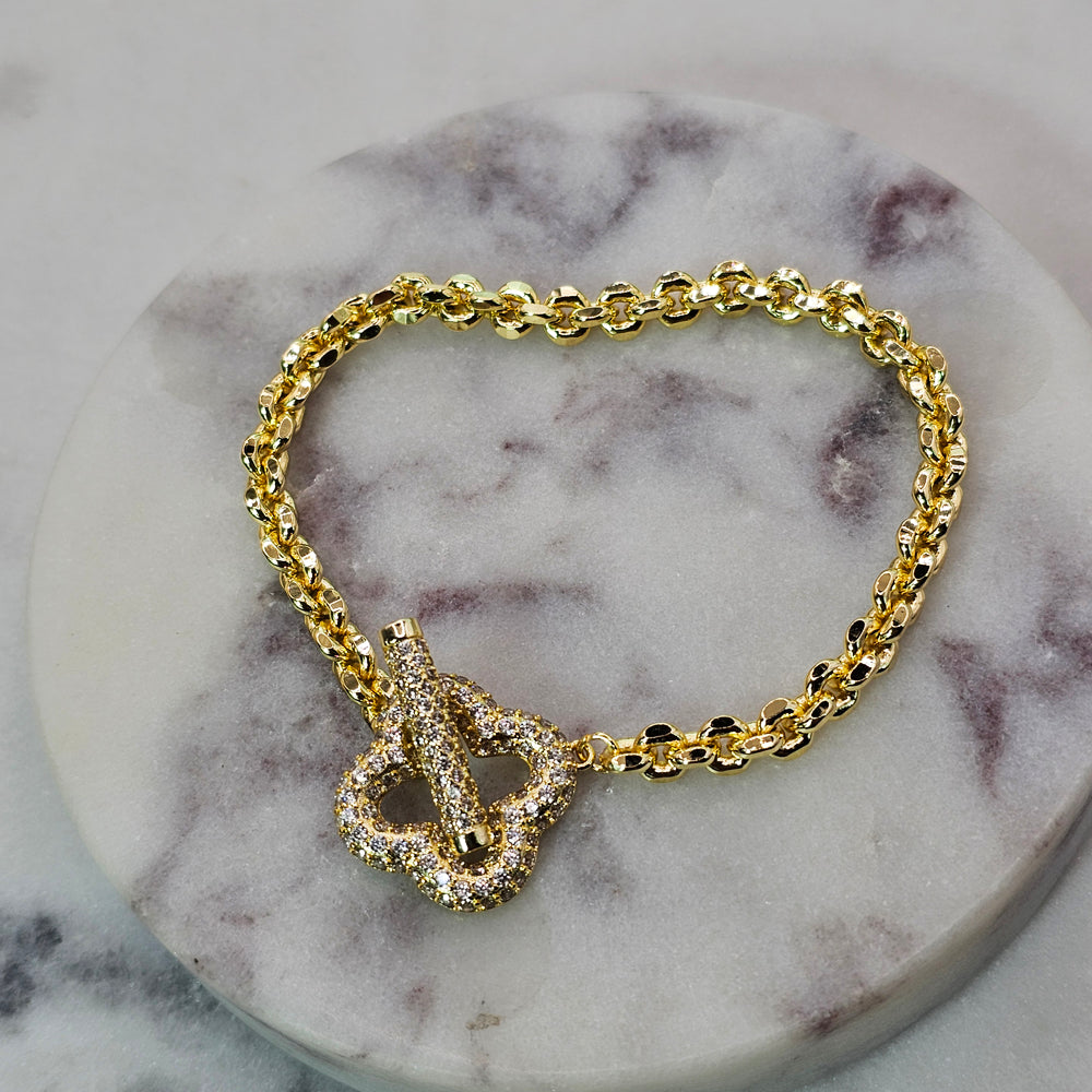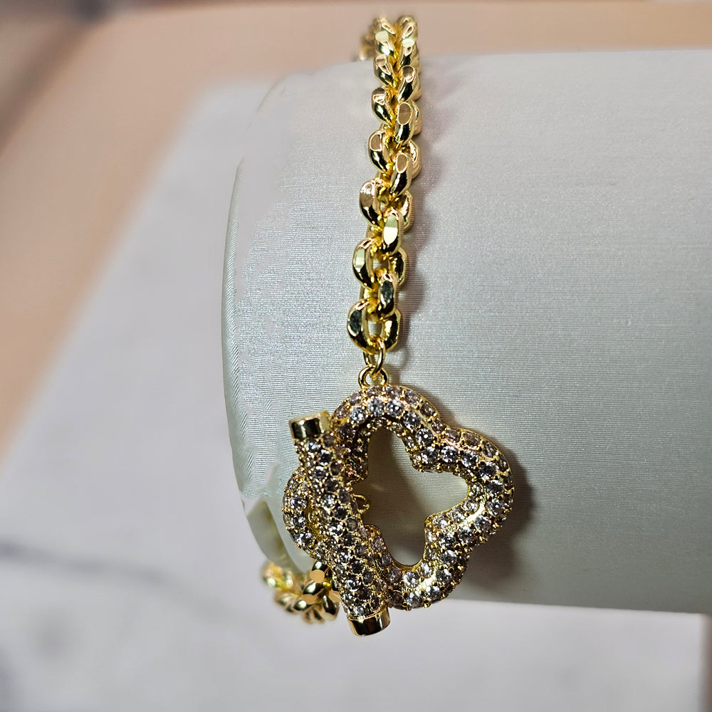 Pulsera bañada en oro con delicada cadena terminada en un fino trébol adornado con pequeños circones, y broche también decorado con brillantes detalles. Una joya elegante y sofisticada que destaca por su delicadeza y luminosidad.