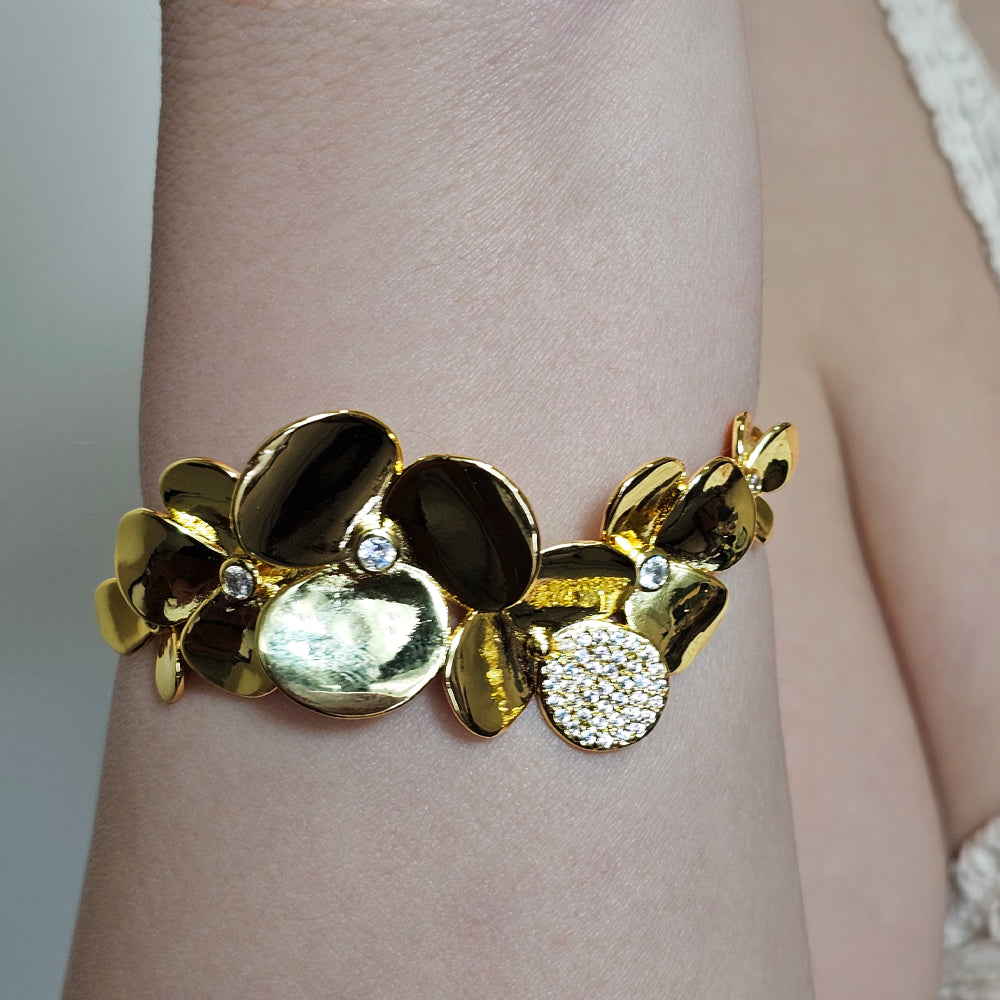 Pulsera bañada en oro con diseño de esclava, embellecida con delicados pétalos de flor finamente adornados con pequeños circones que aportan destellos de luz y sofisticación. Una joya femenina y refinada, ideal para destacar con elegancia en cualquier ocasión.