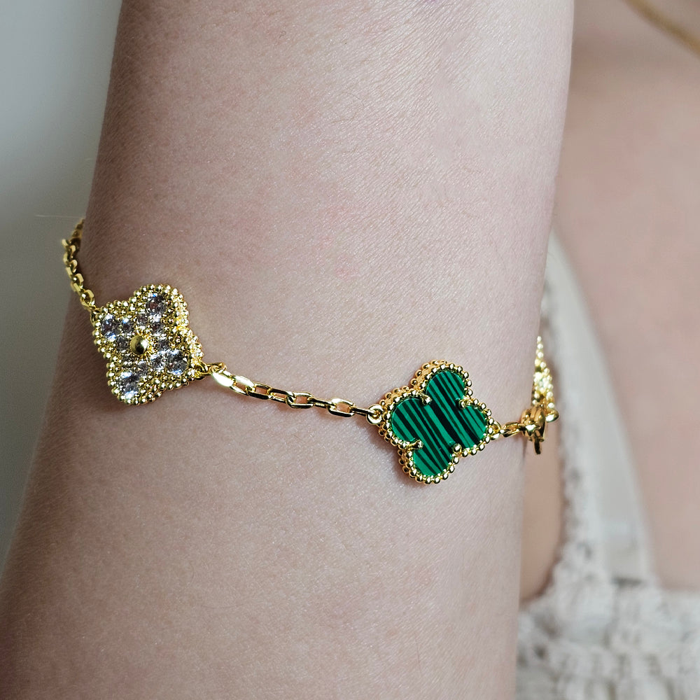 Pulsera bañada en oro, embellecida con delicadas flores en tono verde intercaladas con flores adornadas con cristales que aportan un brillo sutil y refinado. Una joya femenina y sofisticada, ideal para añadir un toque de color y elegancia a cualquier estilo.