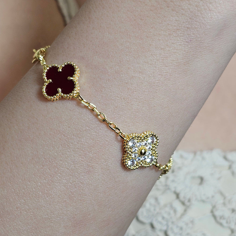 Pulsera bañada en oro, embellecida con delicadas flores en tono rojo intercaladas con flores adornadas con cristales que aportan un brillo sutil y refinado. Una joya femenina y sofisticada, ideal para añadir un toque de color y elegancia a cualquier estilo.