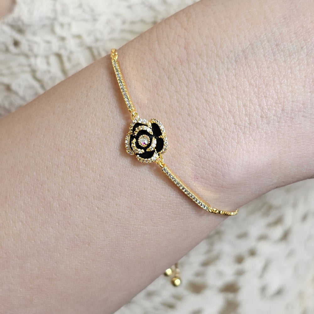 Pulsera bañada en oro, diseñada con una cadena fina que sostiene una delicada rosa en color negro, realzada por un halo de circones que aportan brillo y sofisticación. Su cierre ajustable asegura un calce perfecto, convirtiéndola en una pieza elegante y versátil, ideal para complementar cualquier ocasión con un toque distintivo.