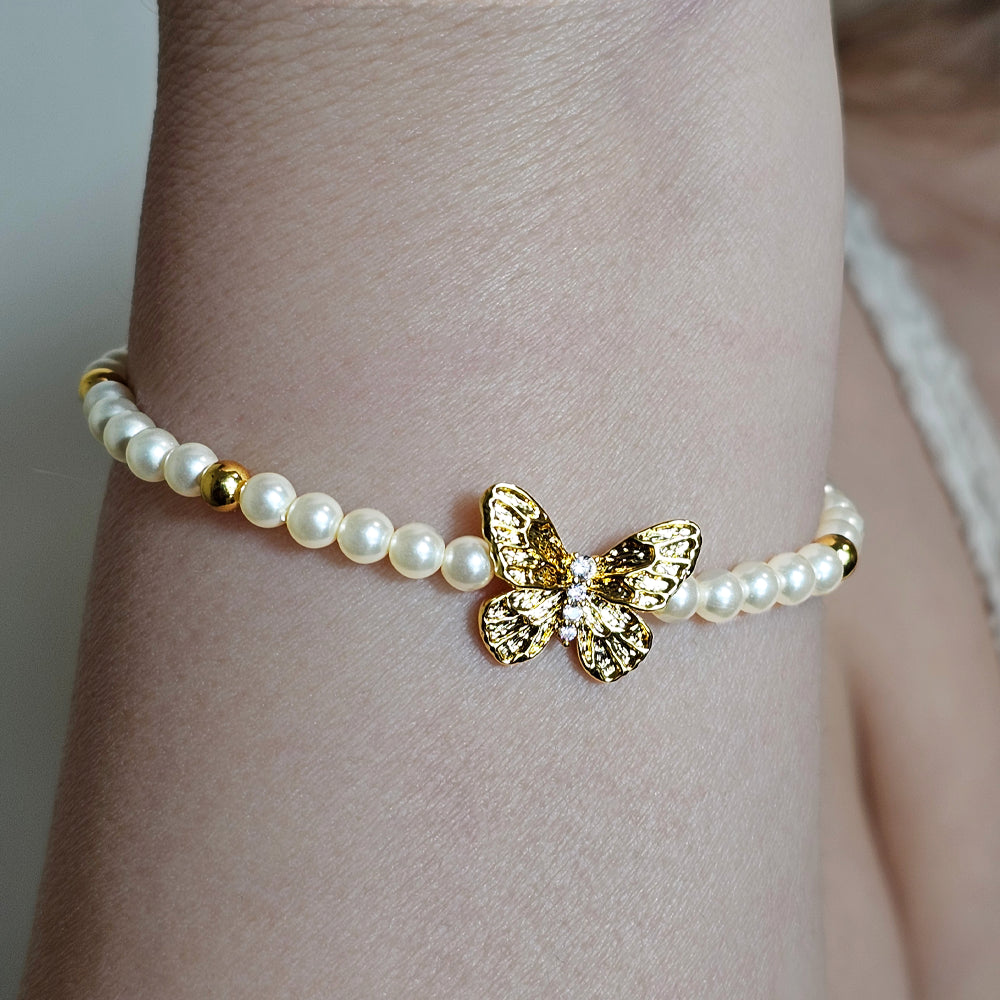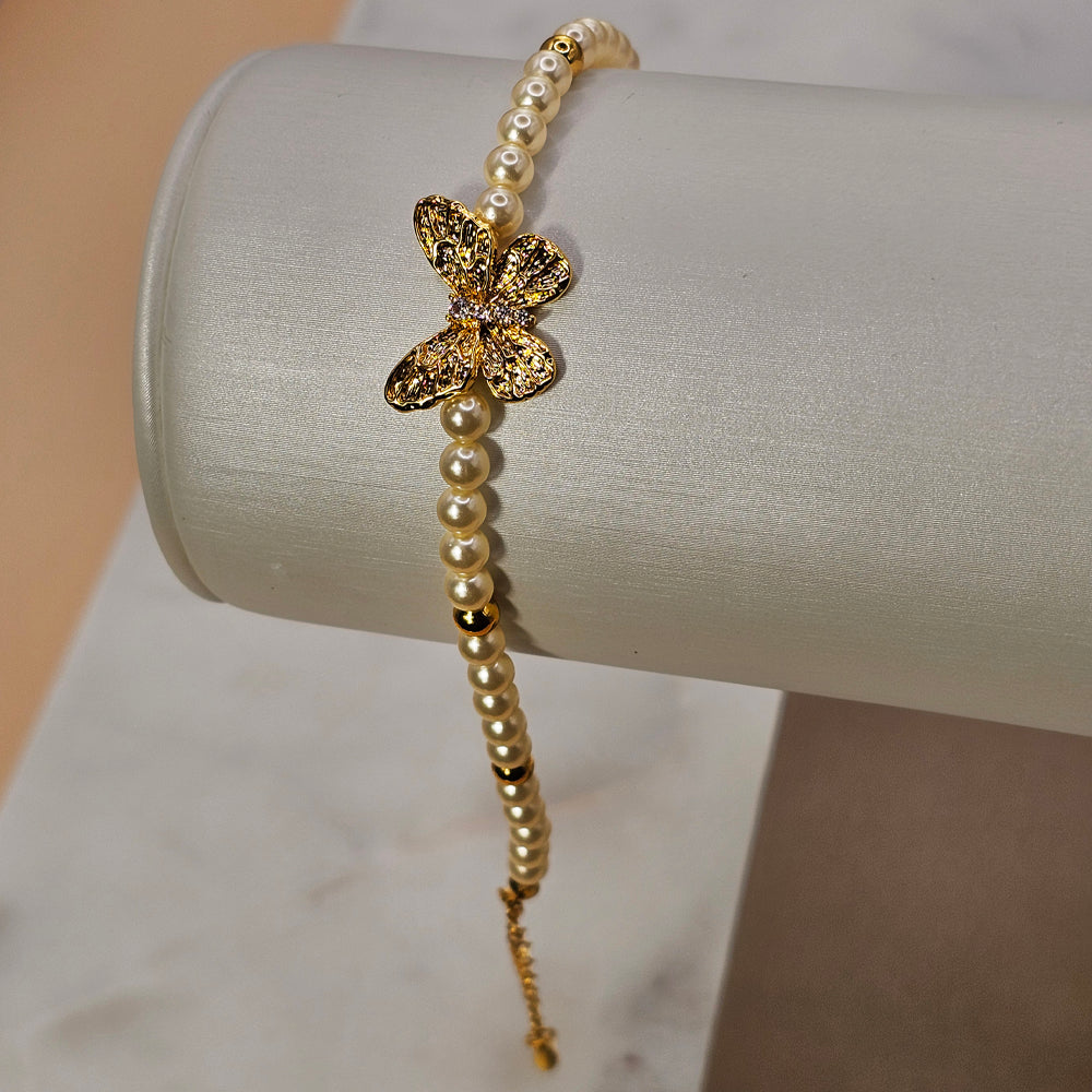 Pulsera bañada en oro, diseñada con delicadas pequeñas perlas que aportan un aire clásico y femenino, realzada con un detalle de mariposa adornada con micro circones que añaden un destello sutil y sofisticado. Una joya única, perfecta para acompañar cualquier ocasión con elegancia y dulzura.